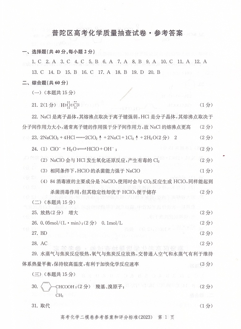 2023版 走向成功高考二模卷化学仅答案2023上海高考二模卷高三化学试卷参考答案上海市各区县高考考前质量抽查试卷精编中西书局