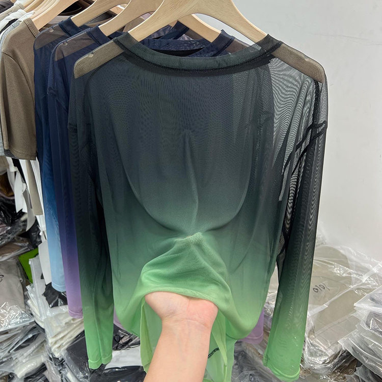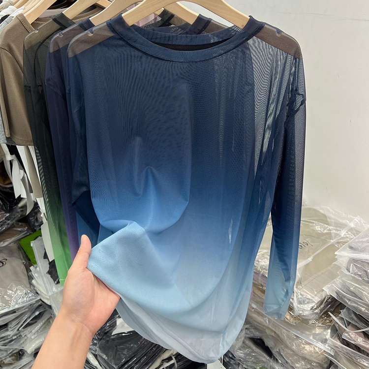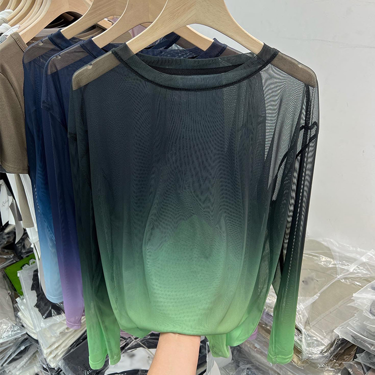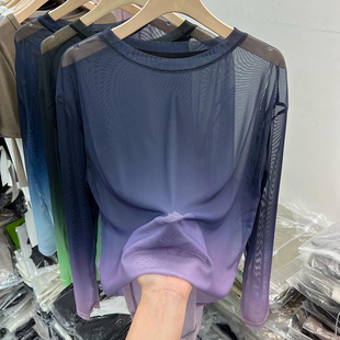 宽松轻薄打底衫 渐变色网纱蕾丝上衣长袖 防晒针织T恤女2023夏新款