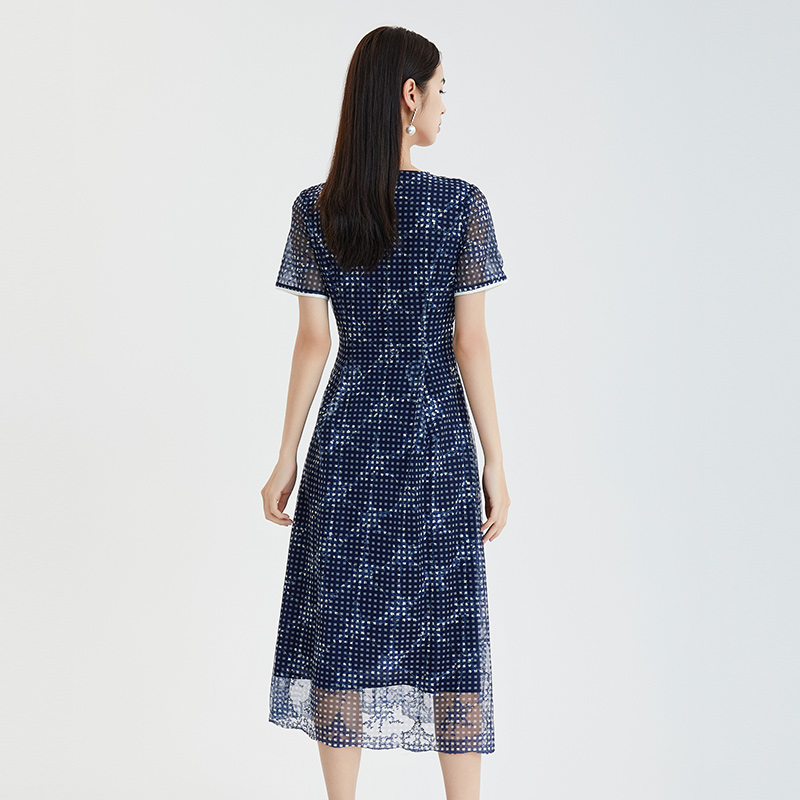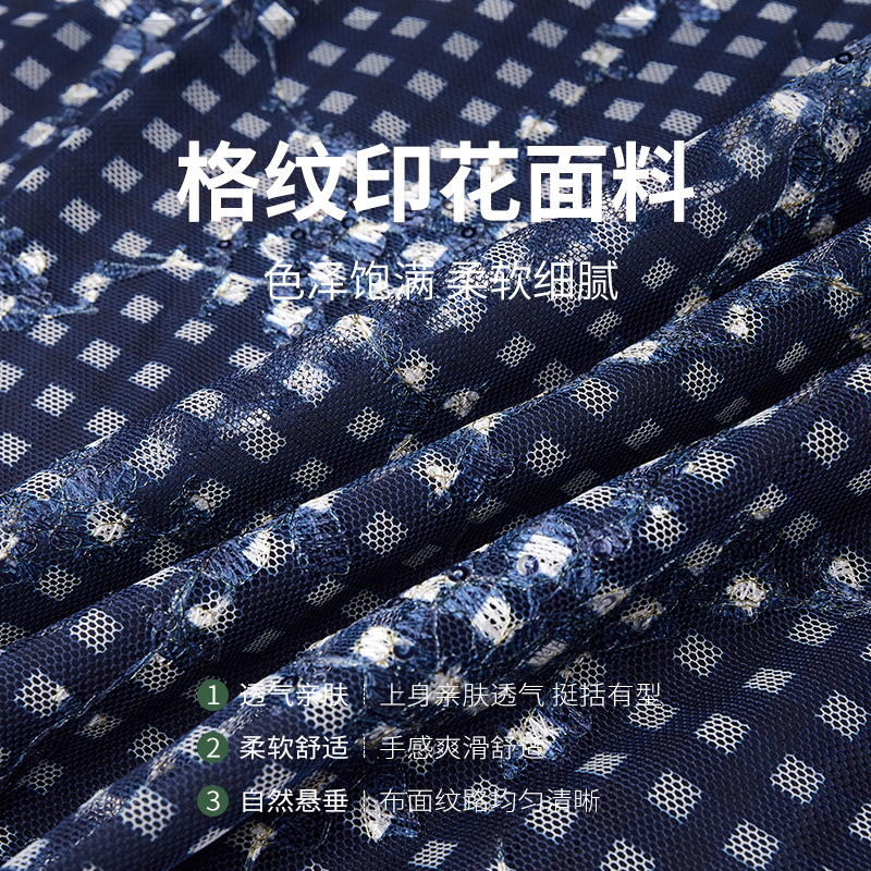马天奴春秋新款 长裙A字裙子流行 宝蓝色V领格子印花蕾丝连衣裙短袖