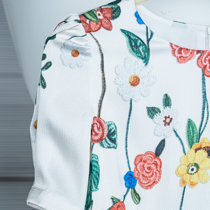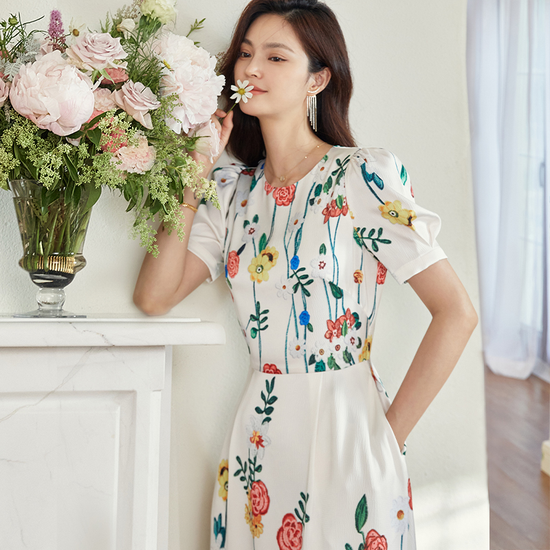 大摆中长裙06938 淑女泡泡袖 罗衣优雅花色缎面连衣裙2025夏装 新款
