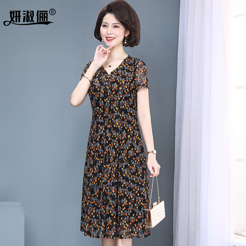 高端洋气台湾纱阔太太中老年女弹力遮肚连衣裙 裙子新款 妈妈装 夏季