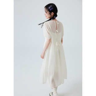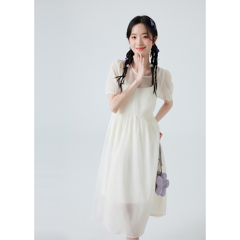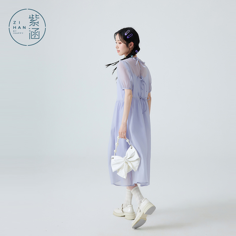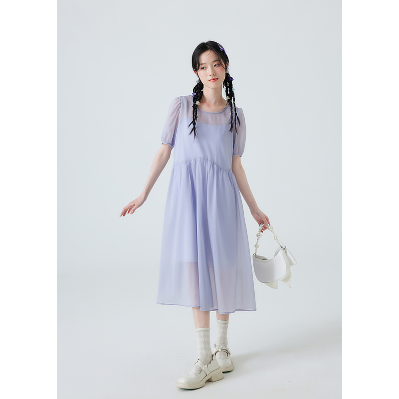 紫涵网纱连衣裙两件套女夏季 森系简约透气中长裙大摆A字裙子 新品