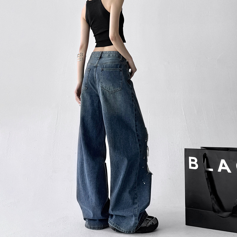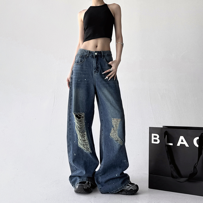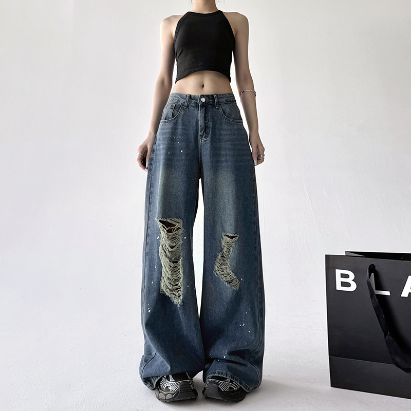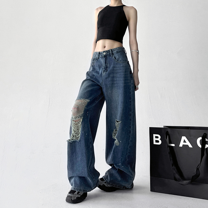 破洞水洗宽松女百搭蓝牛仔长裤 经典 新款 高级感阔腿女2025春季
