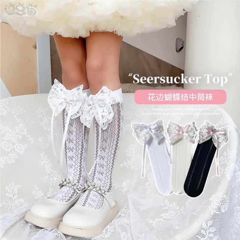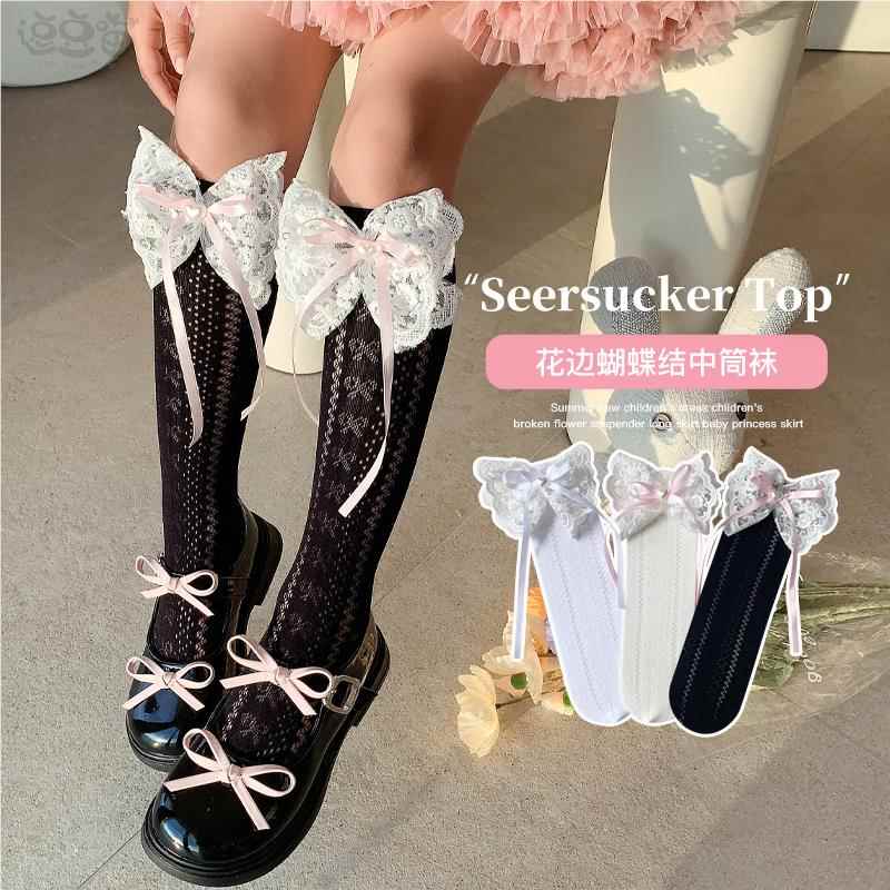 女童袜子春夏中筒袜儿童蕾丝花边蝴蝶结公主袜洋气女孩宝宝长筒袜
