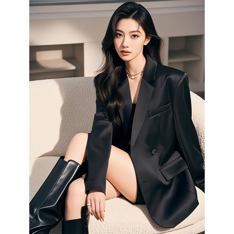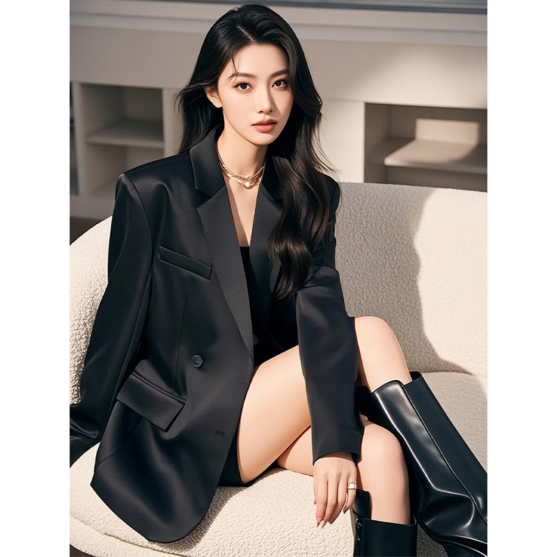 气质女神范高端小西服上衣 外套女2025年春秋新款 黑色长袖 缎面西装