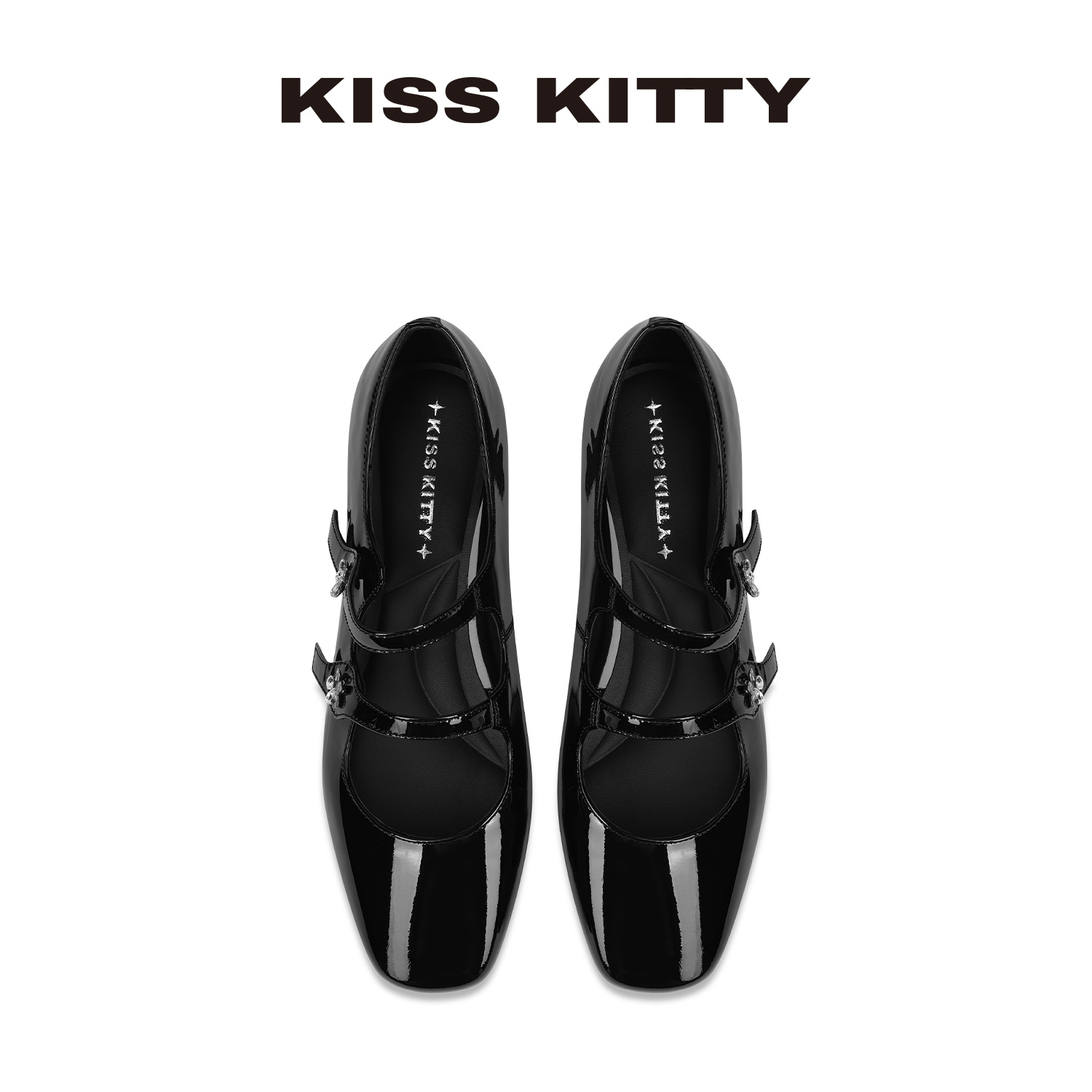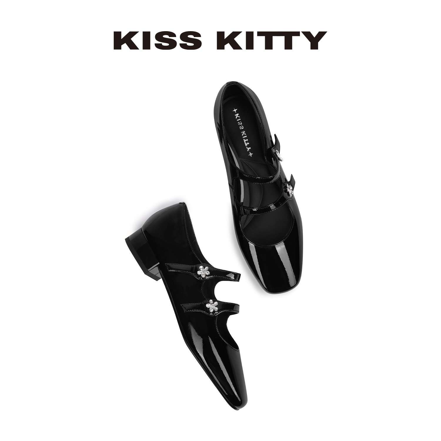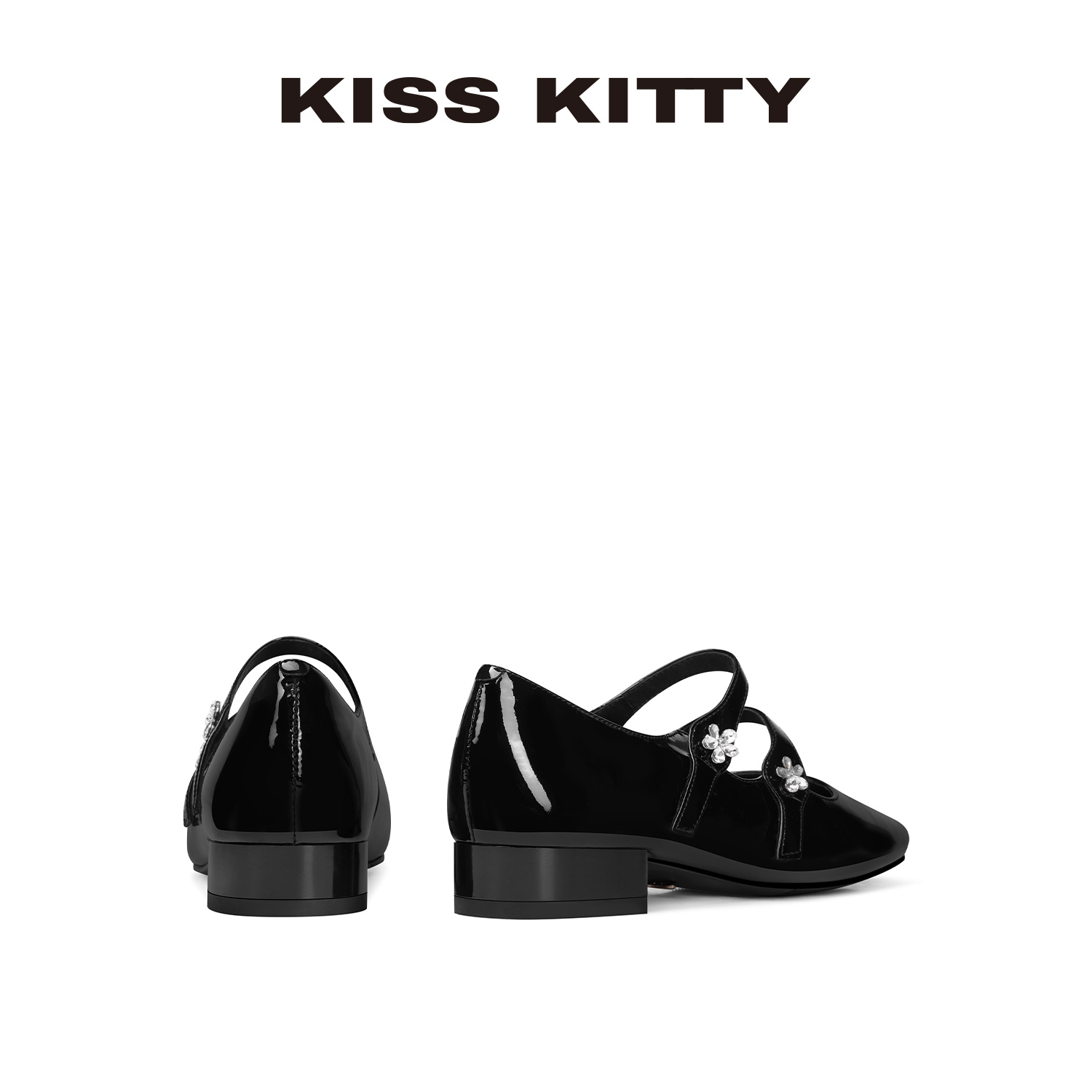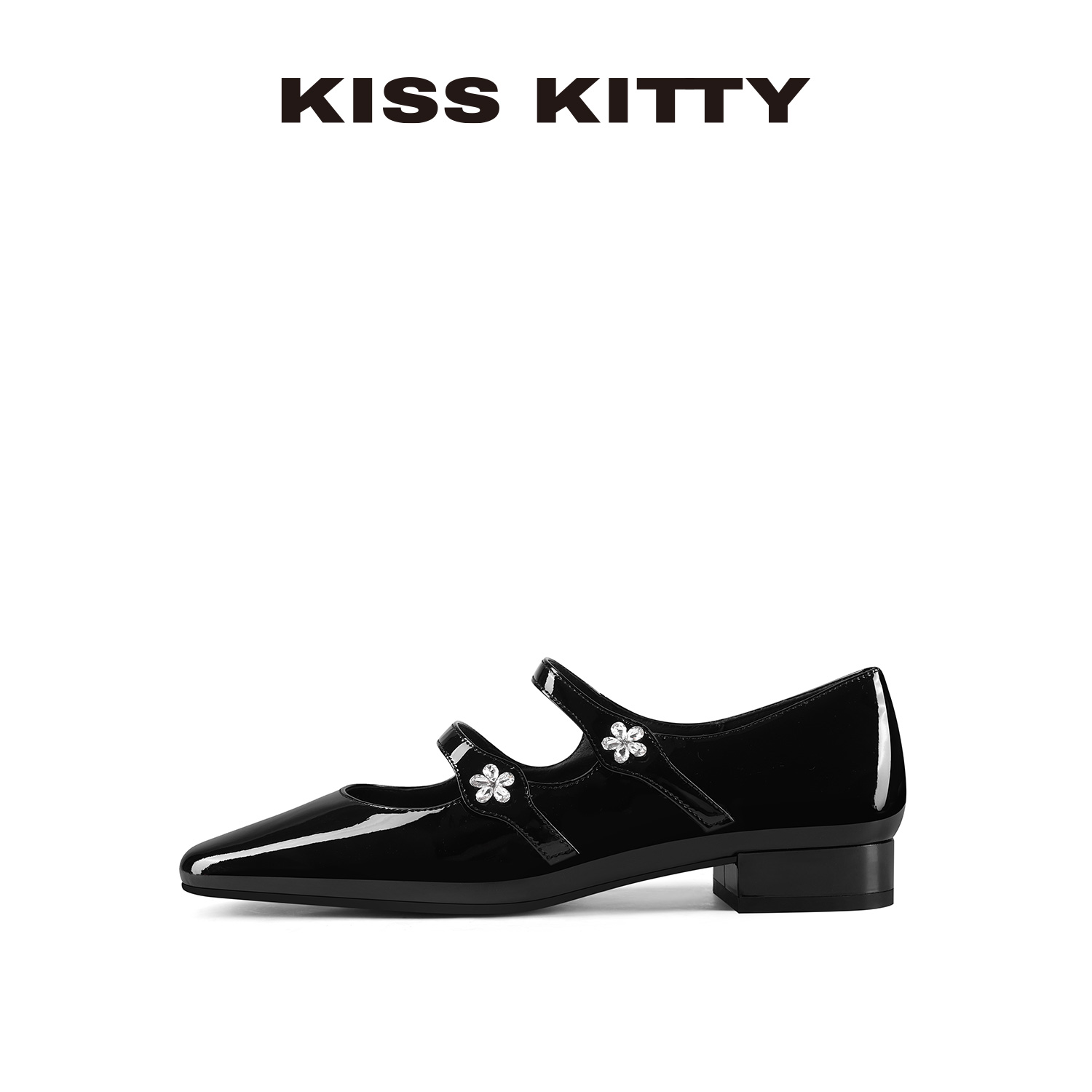 女黑色粗跟山茶花小个子方头单鞋 百搭玛丽珍鞋 新款 KISSKITTY夏季