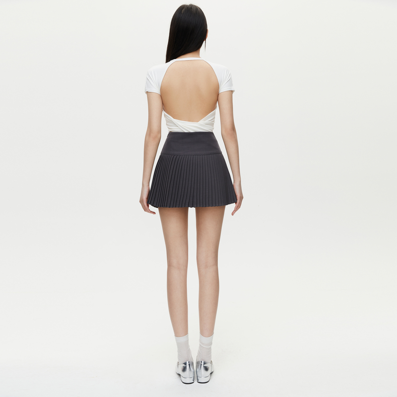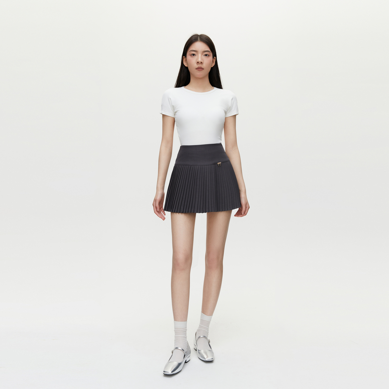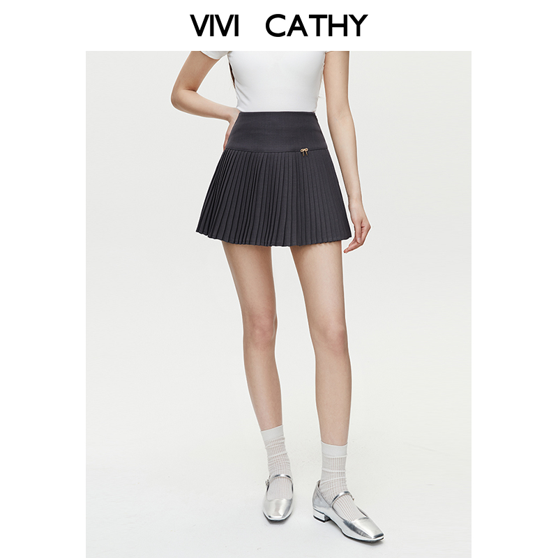 VIVICATHY2025夏季 高腰学院风百褶半身裙女显瘦灰色A字短裙