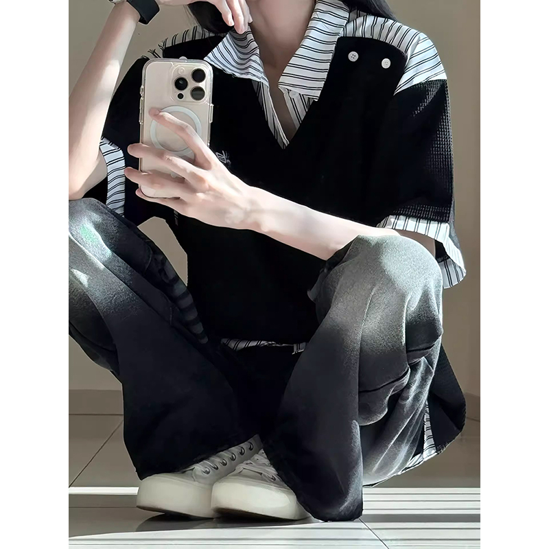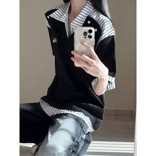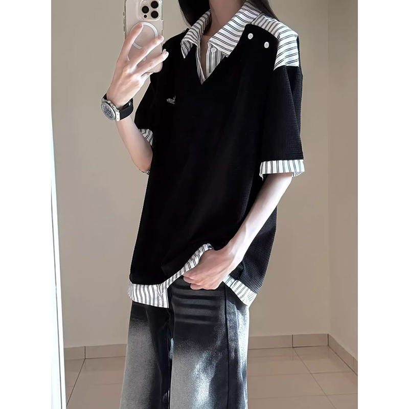 领t恤男生夏季 情侣条纹半袖 美式 短袖 学院风polo衫 假两件拼接衬衫