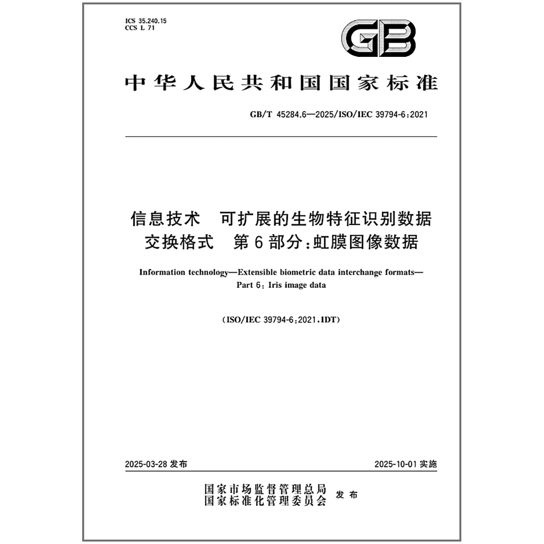 45284.6 生物特征识别数据交换格式 纸质图书 第6部分:虹膜图像数据 可扩展 信息技术 2025
