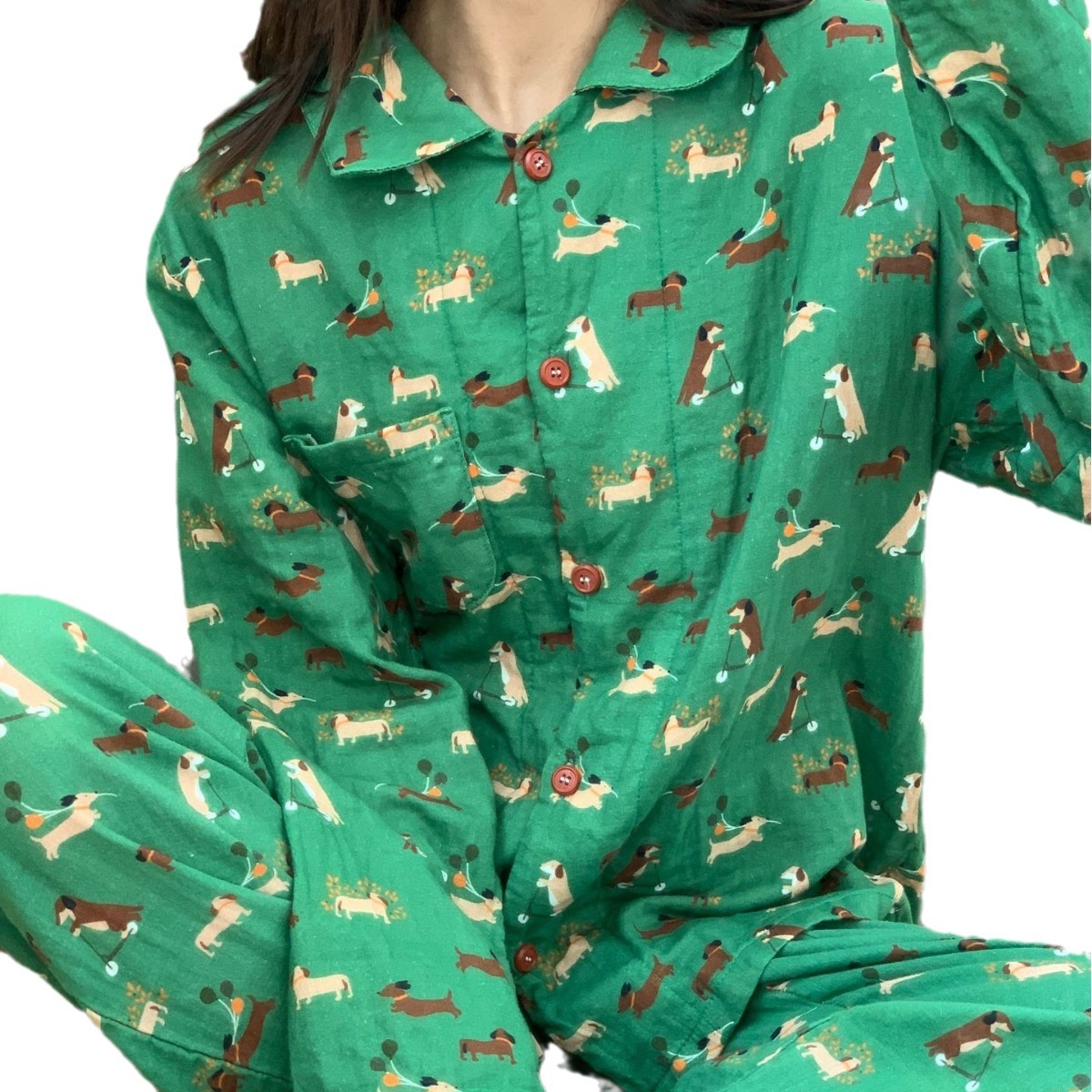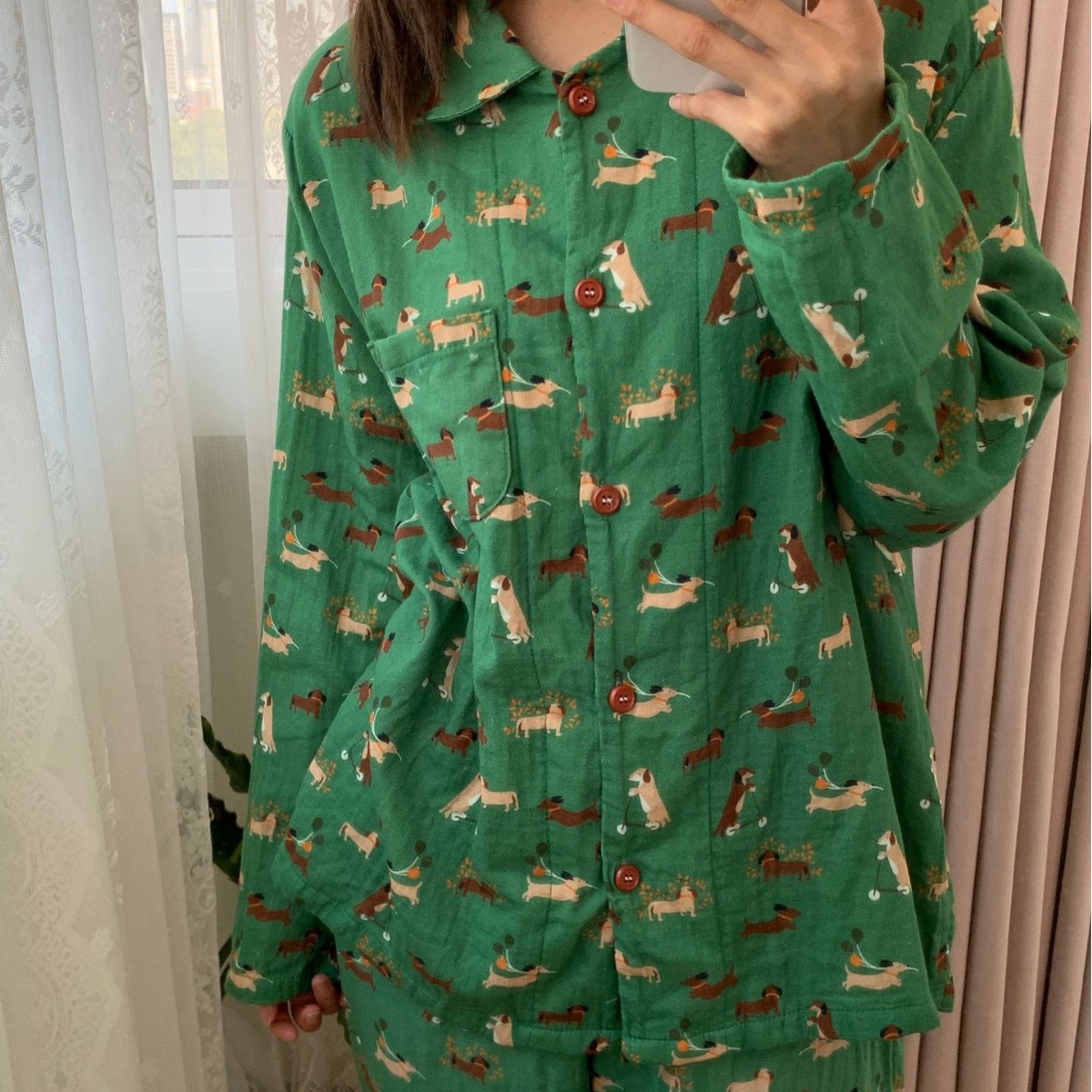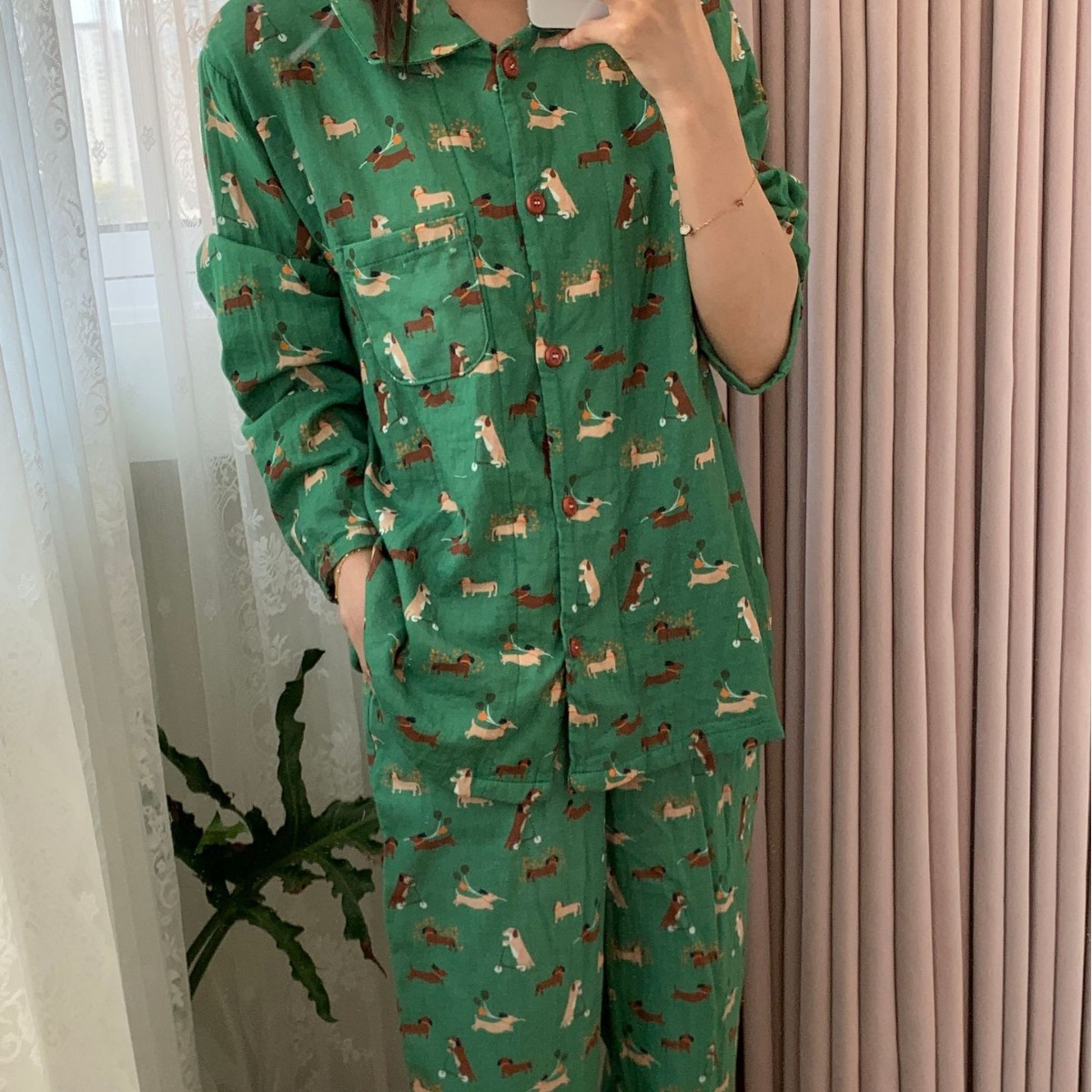 高密双层棉纱韩国2024春夏新品 睡衣家居服 复古绿卡通小狗翻领开衫