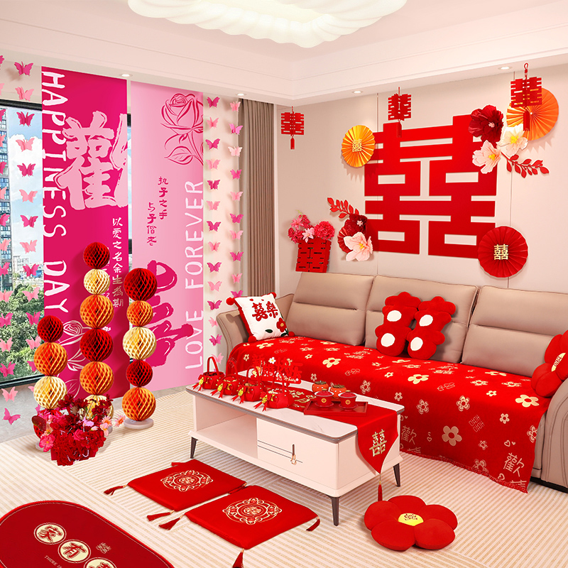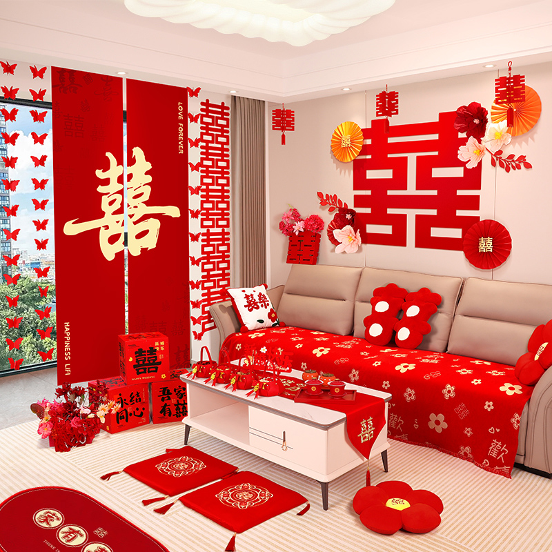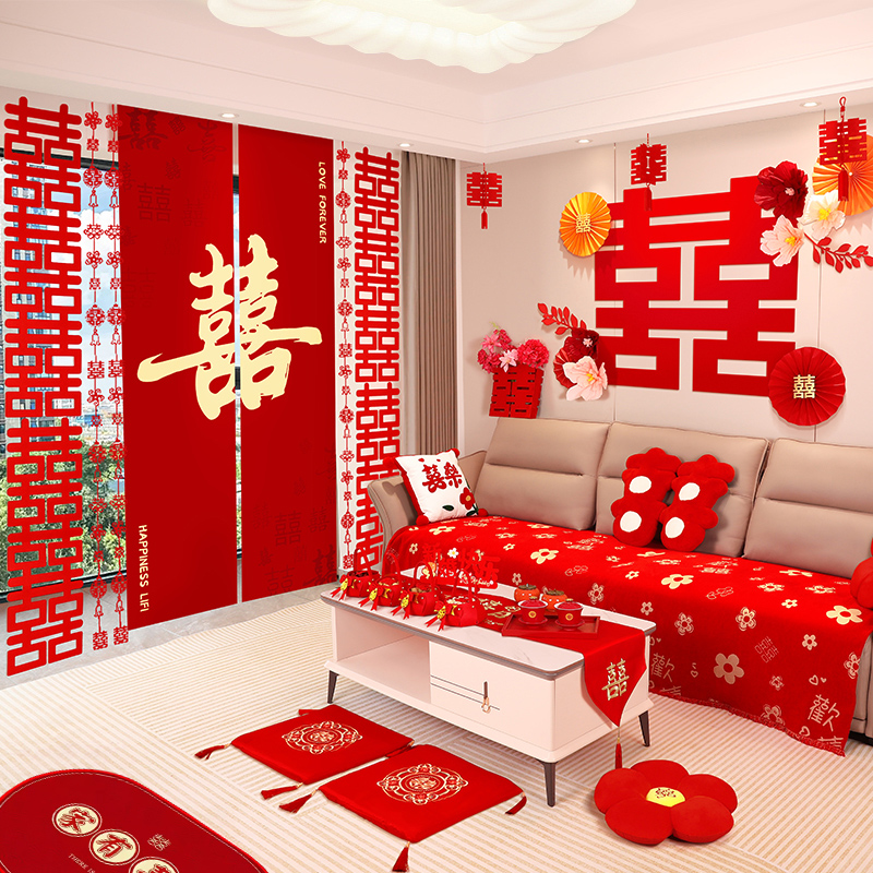 婚房布置套装 饰扮全套女方男卧室客厅条幅喜字挂布 结婚房间窗帘装