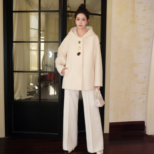 女装 加大码 秋冬赫本风连帽厚绵羊绒毛呢外套 韩版 呢子大衣女中长款
