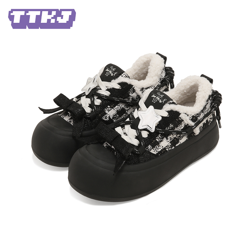 板鞋 TTKJ黑白格厚底女鞋 秋冬蝴蝶结加绒保暖大头休闲运动毛毛棉鞋