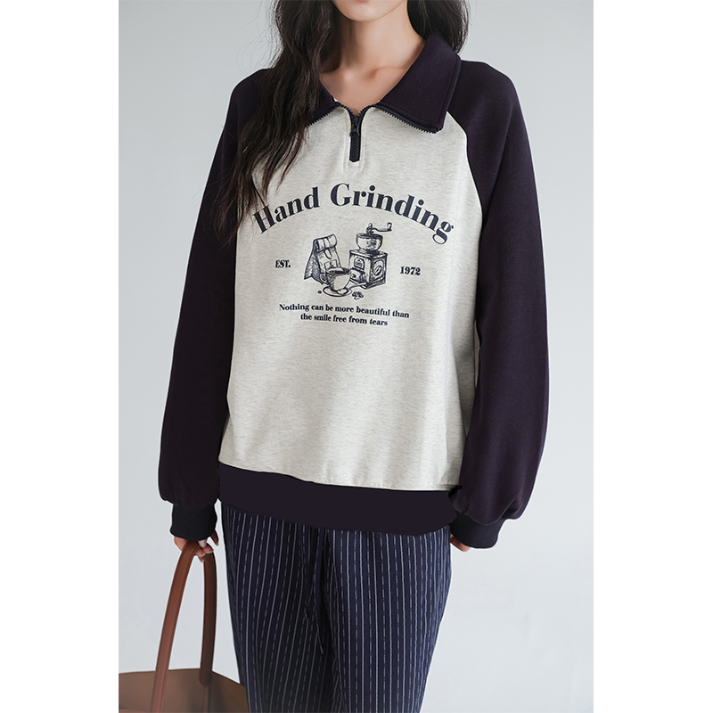 胖mm宽松插肩袖 蓝若水大码 新款 半拉链Polo领印花卫衣秋装 上衣 女装