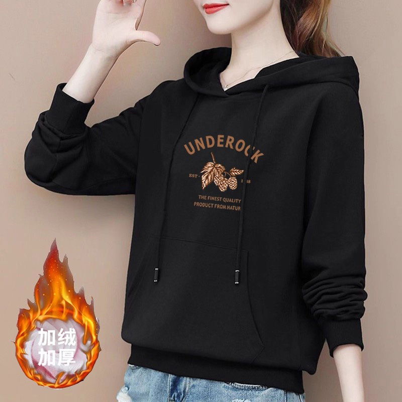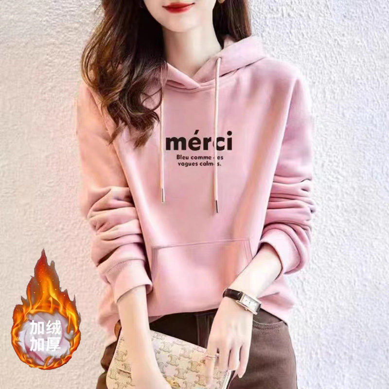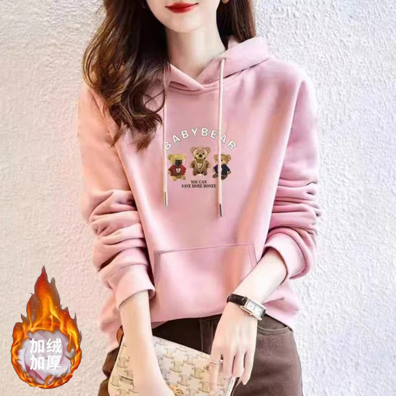 粉色连帽卫衣女纯棉2024秋冬新品 套头休闲印花上衣加绒加厚 韩版