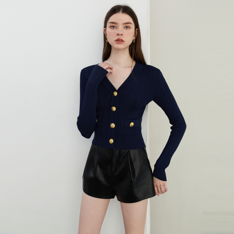 假两件撞色春季 女短款 紧身V领正肩上衣显瘦 森马针织开衫 森柔毛衫