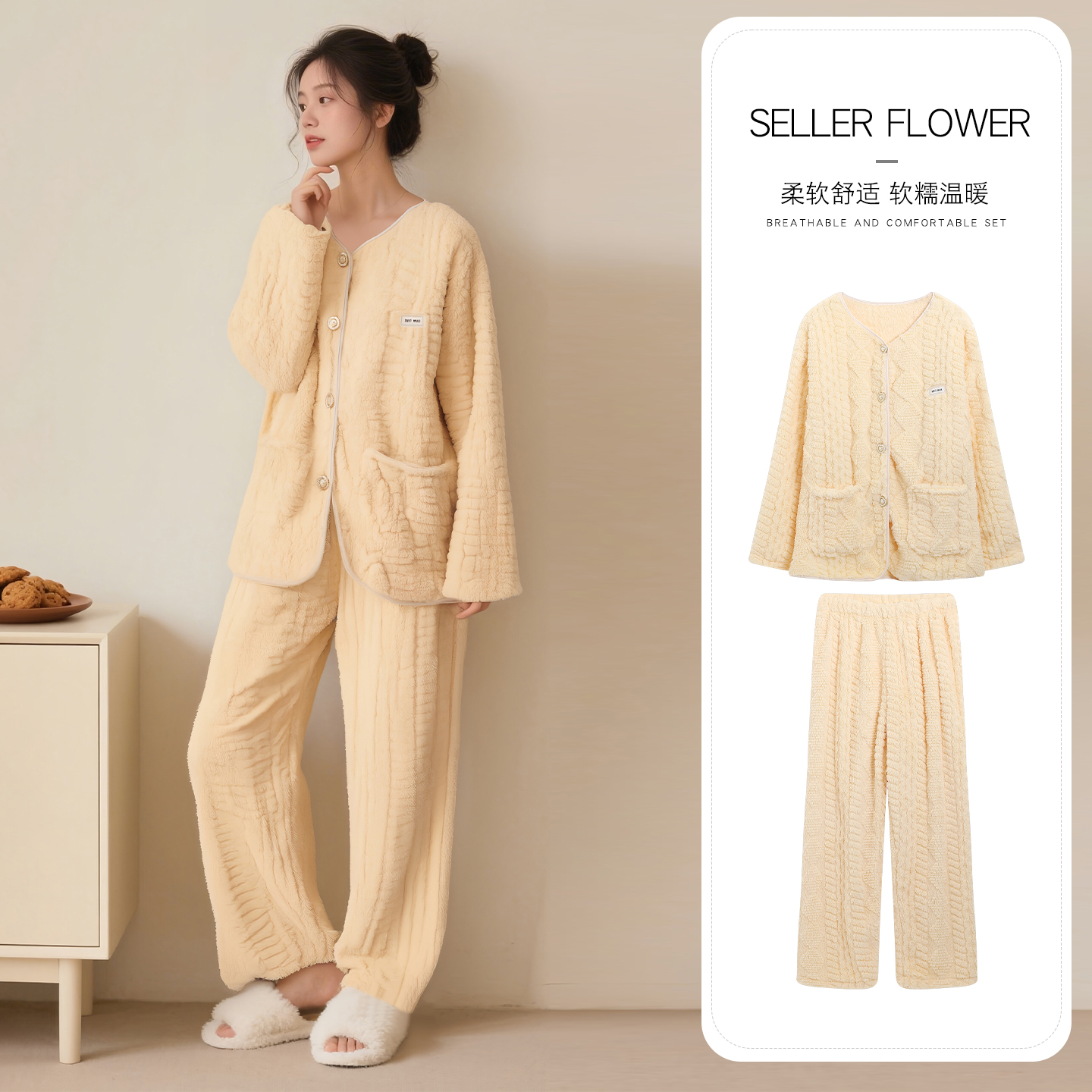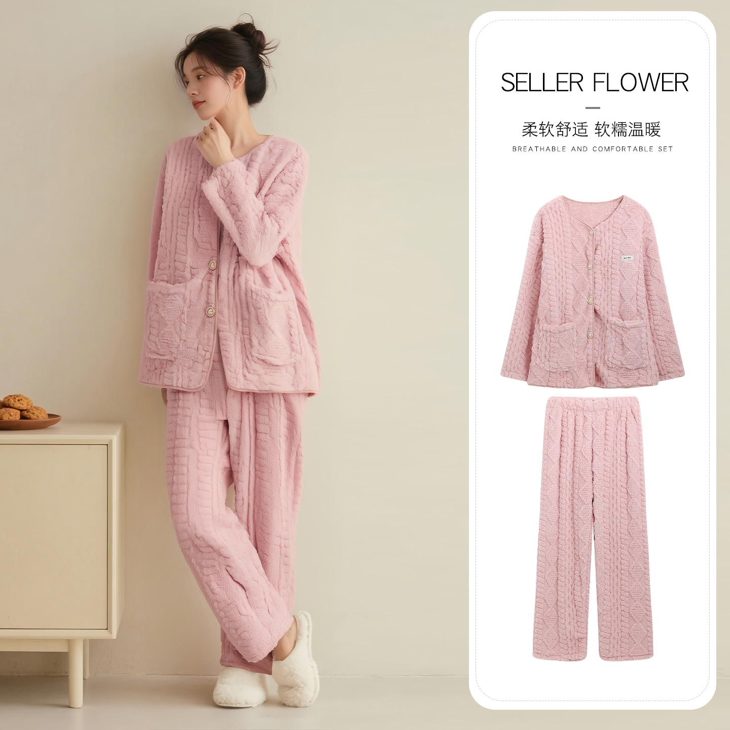 女款 甜美套装 2025年加绒保暖抗静电家居服 新款 珊瑚绒睡衣女秋冬季