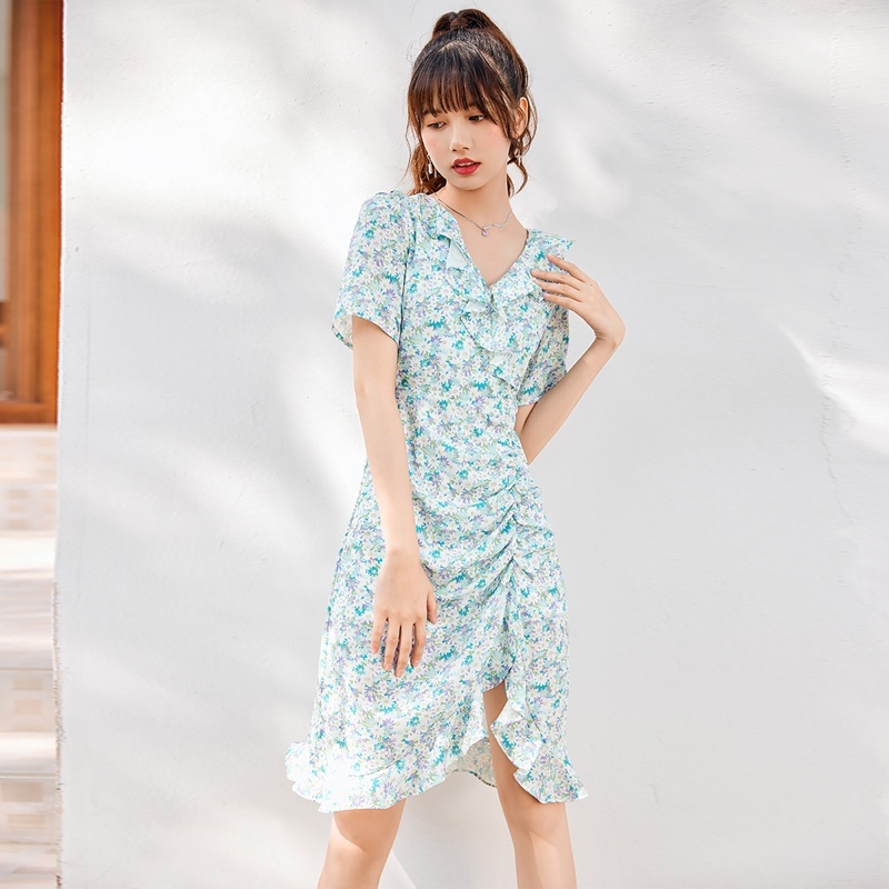 MEETLADYv领小众设计感法式 茶歇裙2023夏新高级感荷叶边连衣裙女