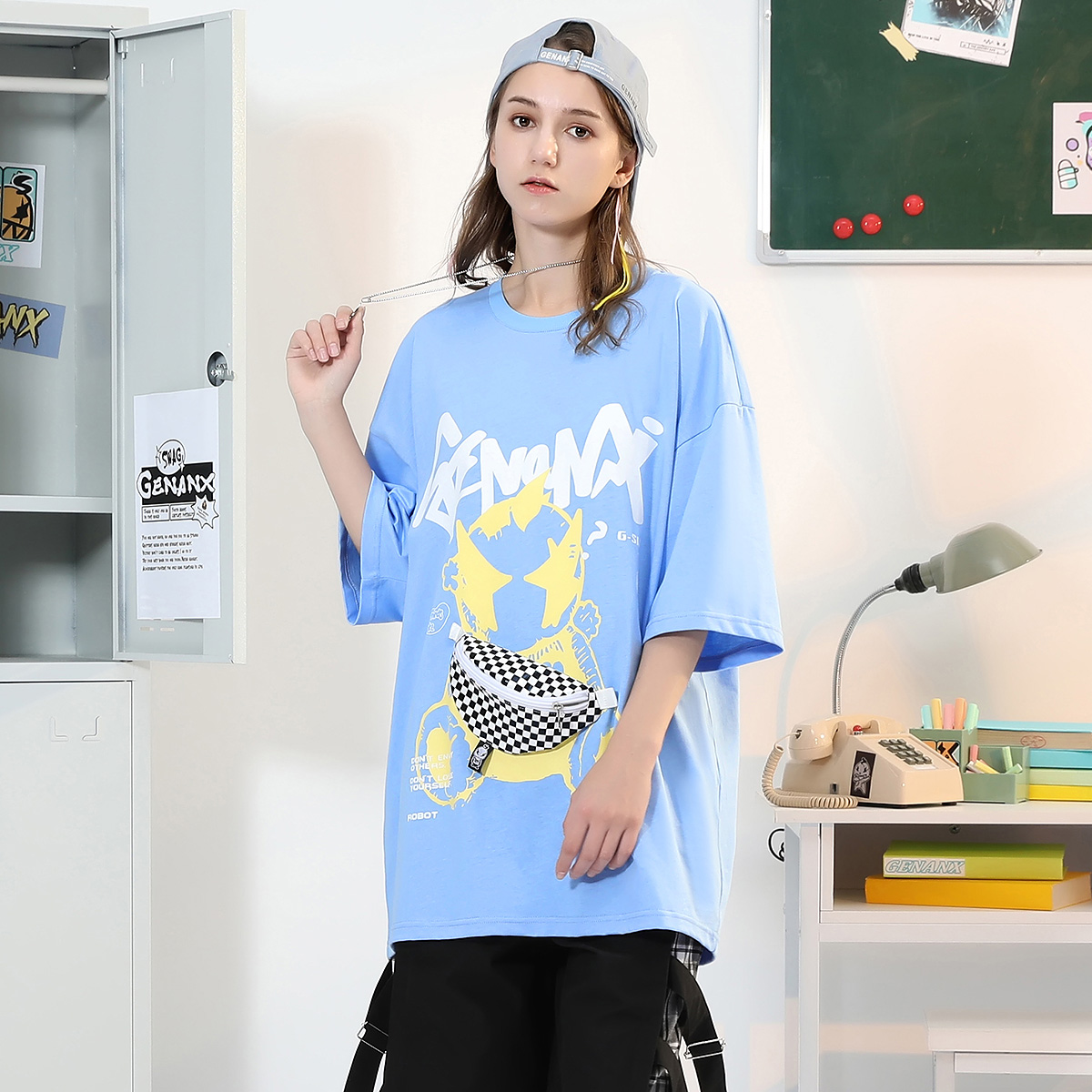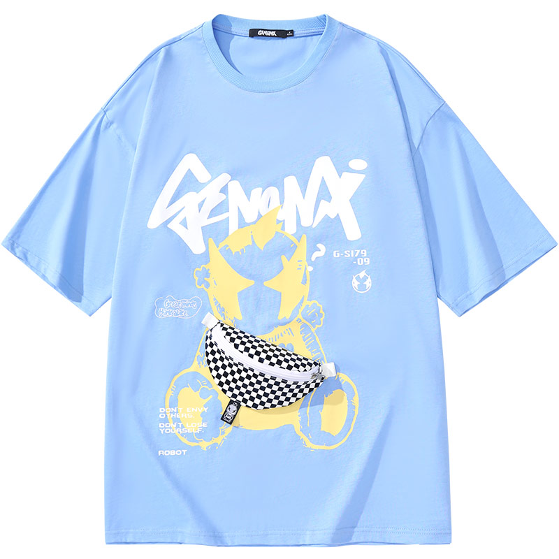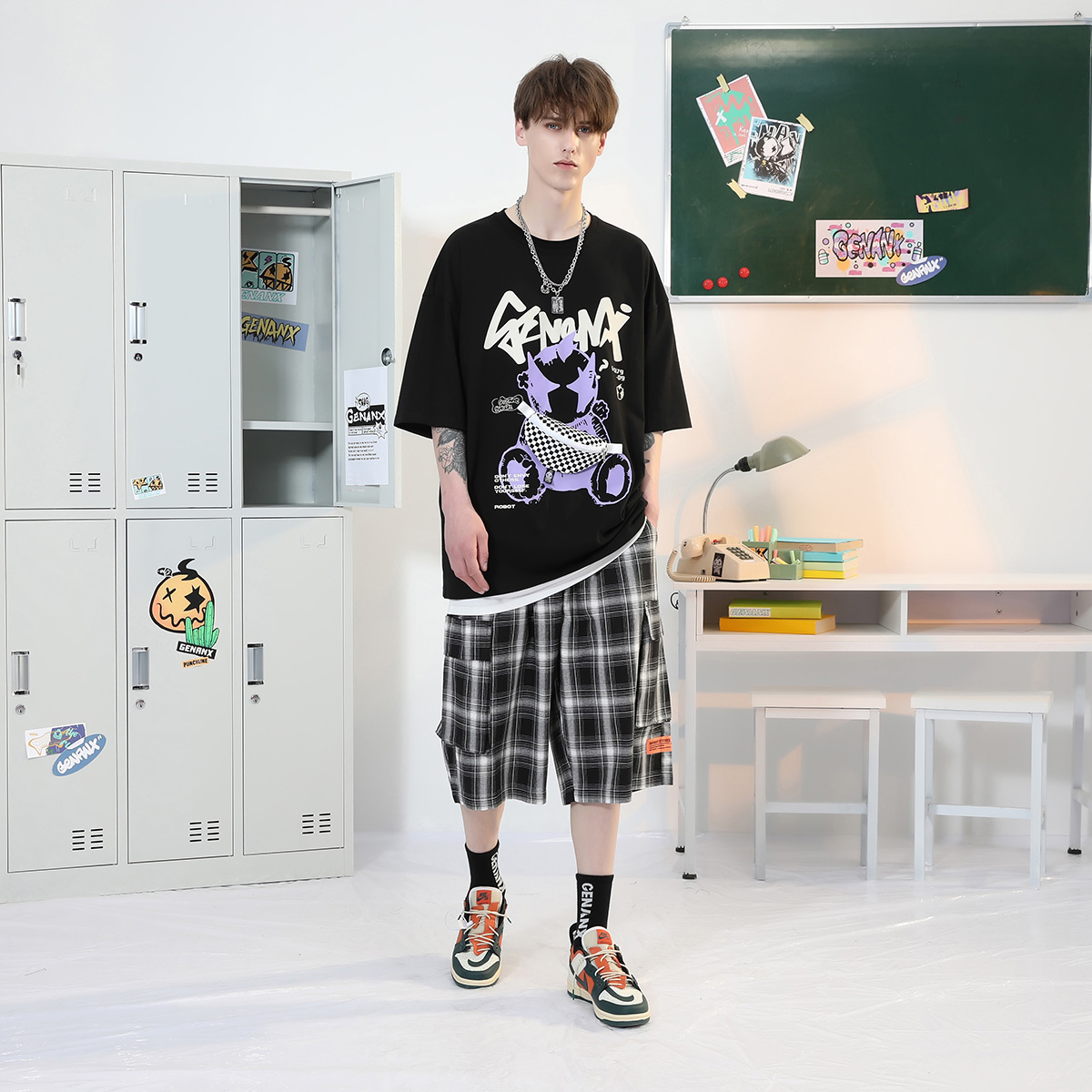 黑白格拉链腰包设计情侣t恤 新款 GENANX闪电潮牌纯棉短袖 上衣夏季