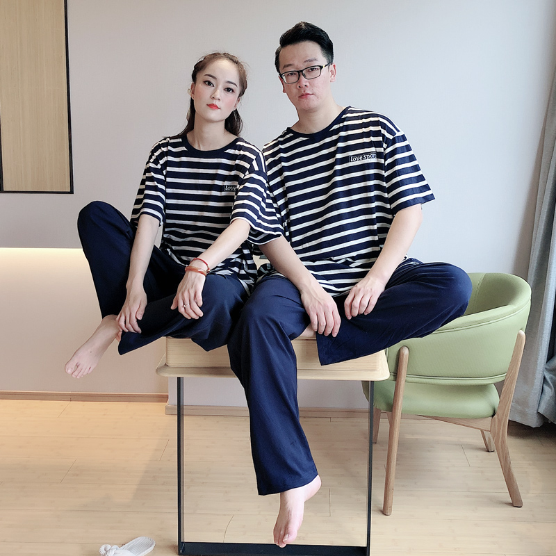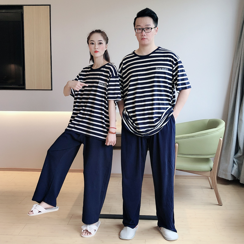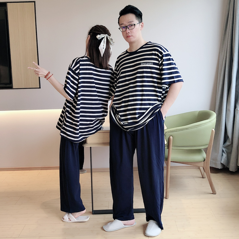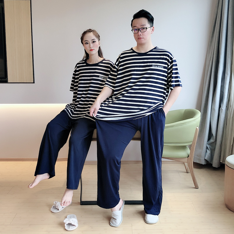 加肥特大家居服套装 长裤 可外穿 200斤休闲短袖 条纹情侣夏睡衣大码