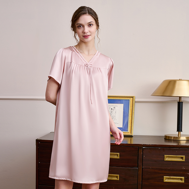 圆领蕾丝 宽松短袖 美标真丝睡衣女士100%桑蚕丝睡裙家居服夏季 大码