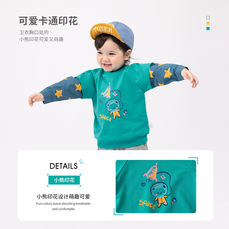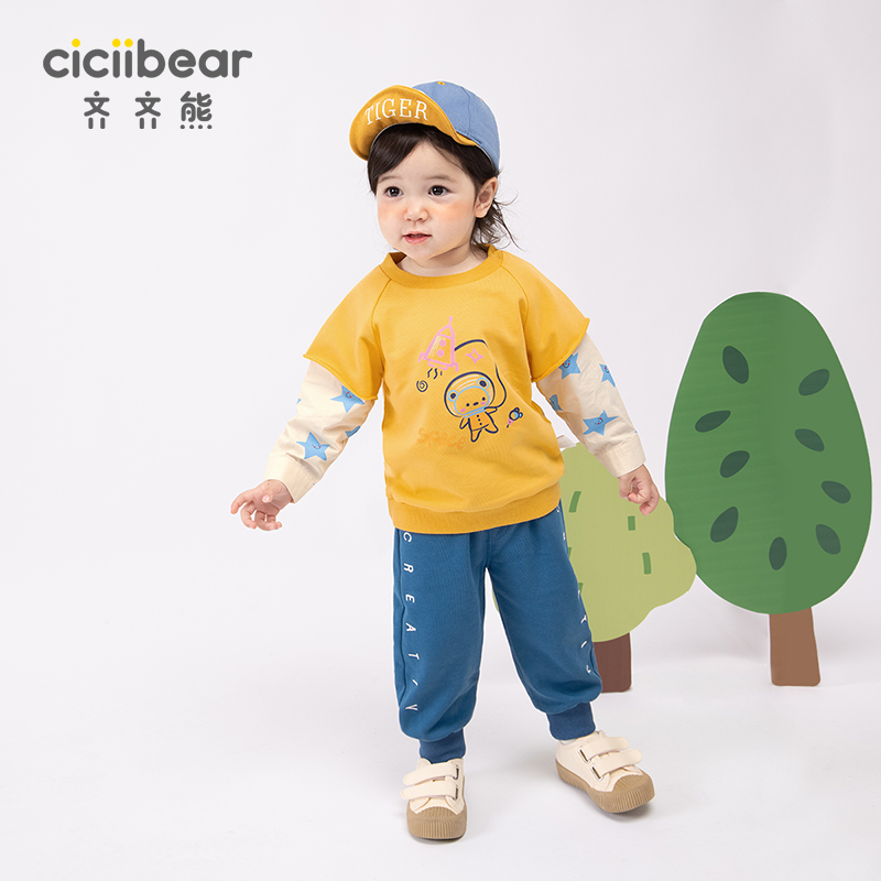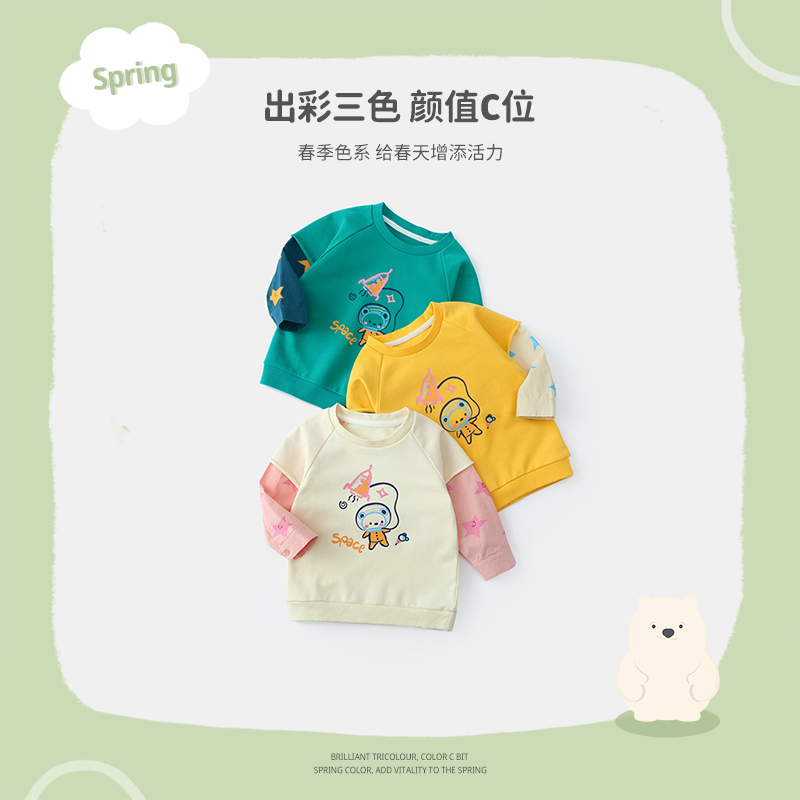 上衣 婴儿假两件男宝宝春装 齐齐熊男童卫衣春秋卡通新款 儿童套头衫