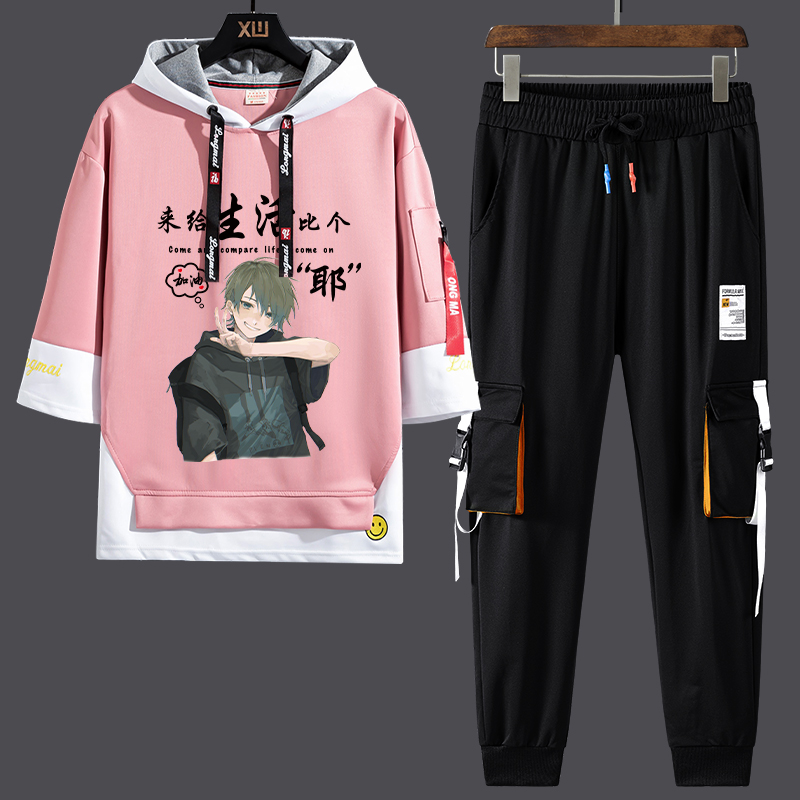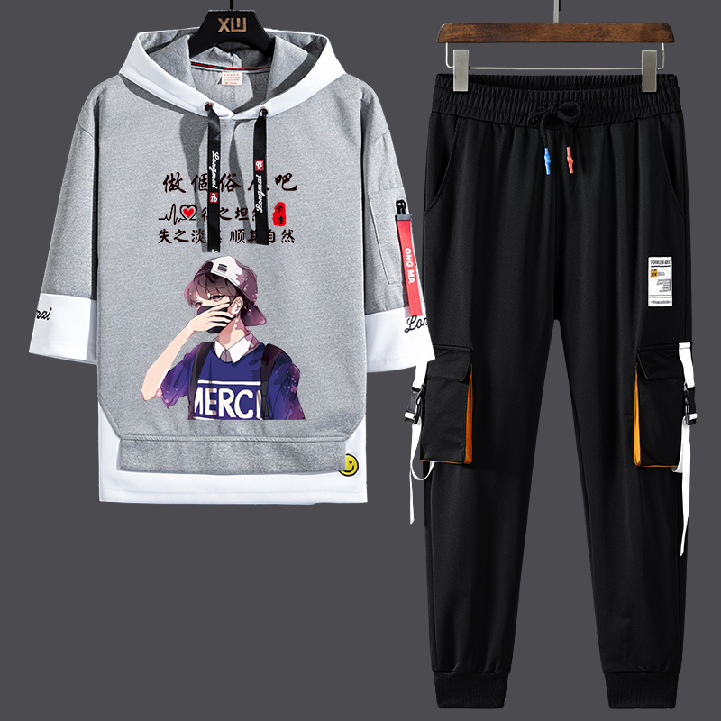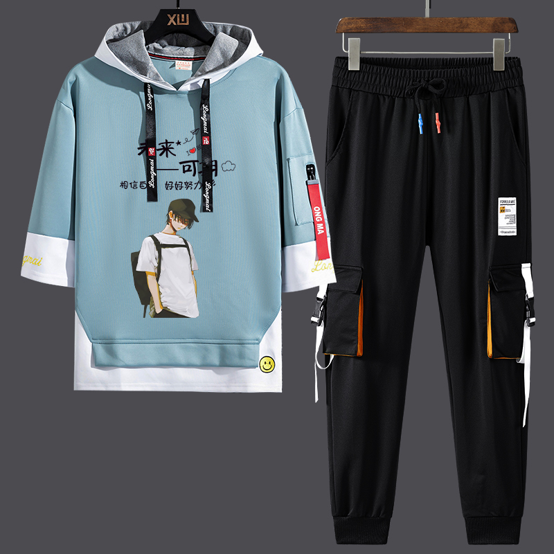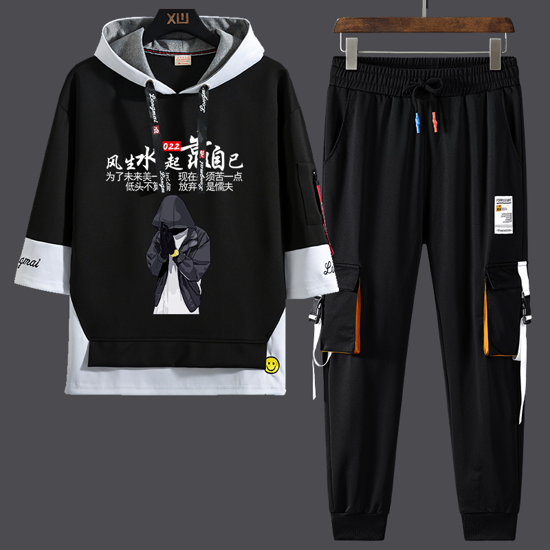 男生韩版 t恤套装 潮流学生帅气ins新款 休闲宽松七分袖 夏季 长裤 短袖