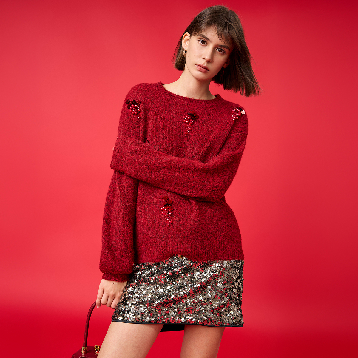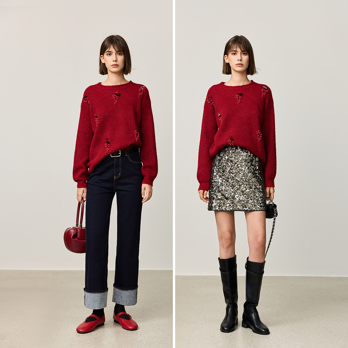 24冬新品 LILY圣诞新年休闲软糯加厚红色毛衣针织衫 热红酒毛衣