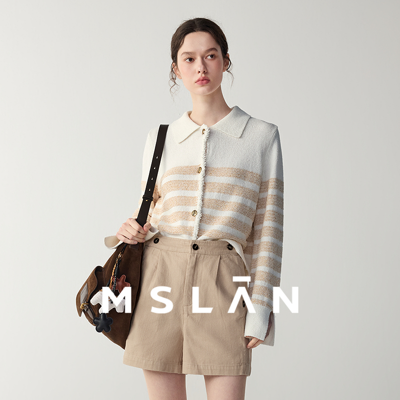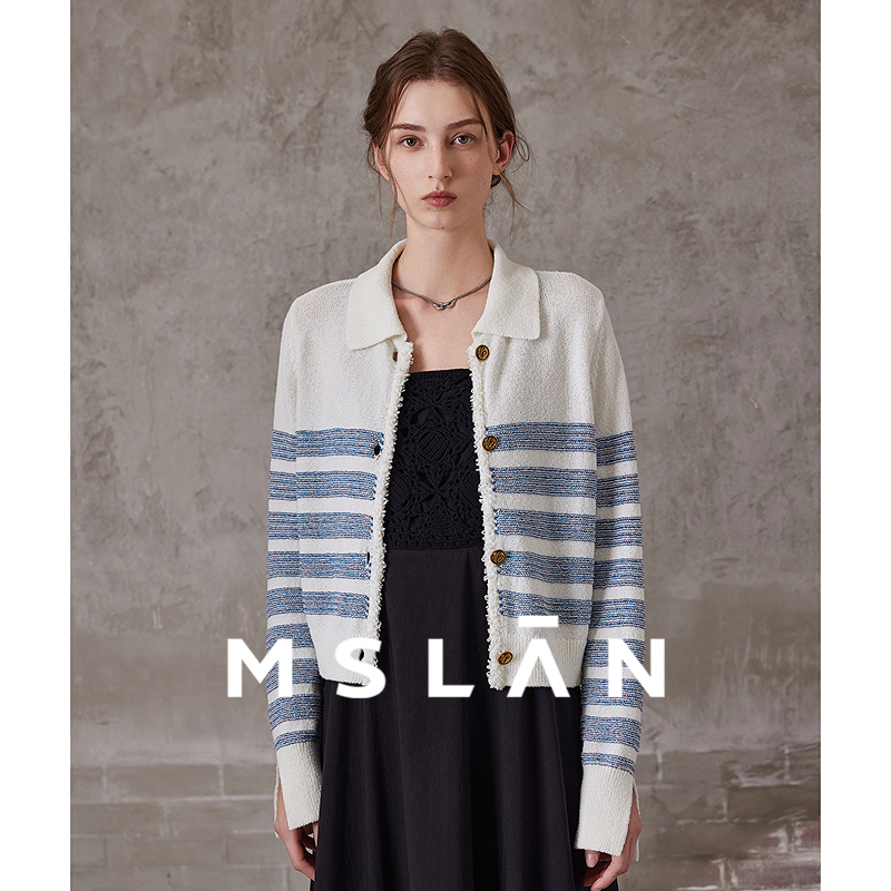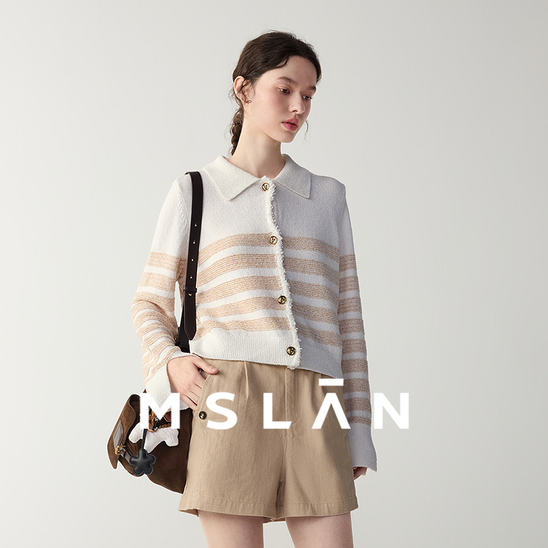 MSLAN小香风针织衫 外套女 25早秋复古miu风翻领宽松条纹撞色开衫
