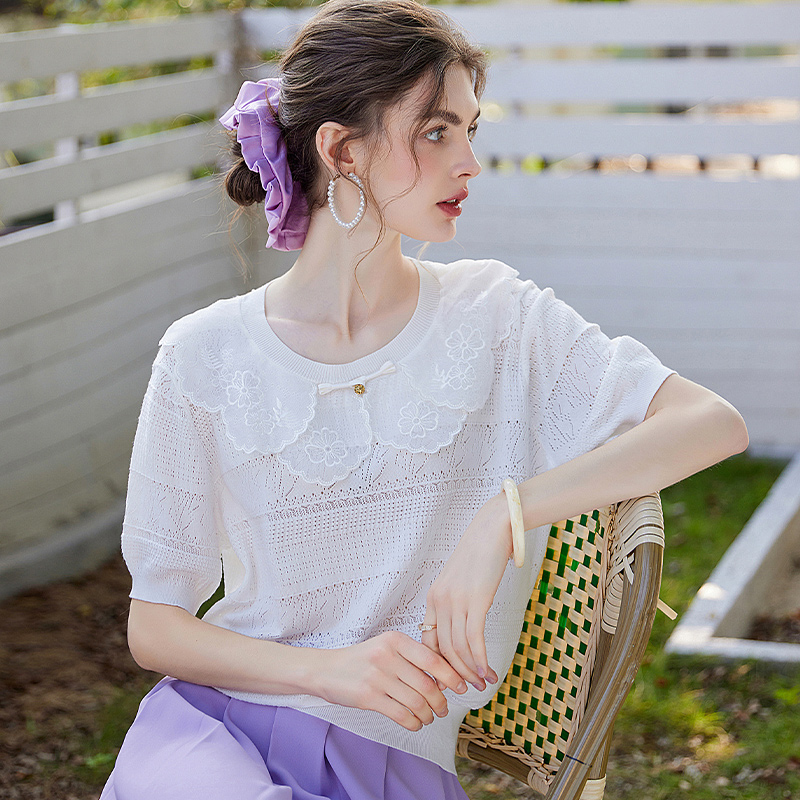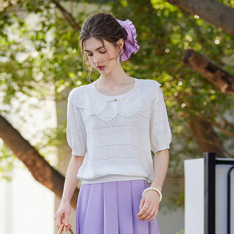 针织衫 白鹿语镂空提花上衣25夏款 女式 圆领花边套头短袖 甜美时尚