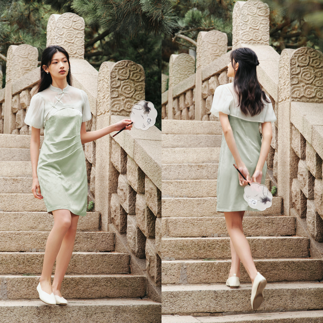 新中式 2024夏新款 两件套 罩衫 森马连衣裙女肌理吊带裙小立领泡泡袖