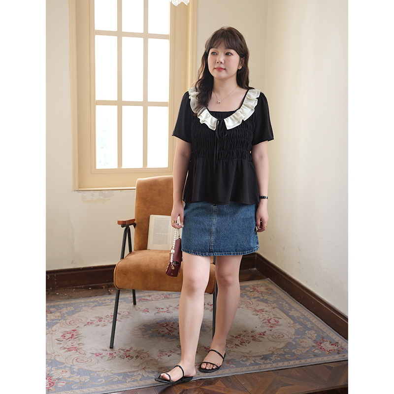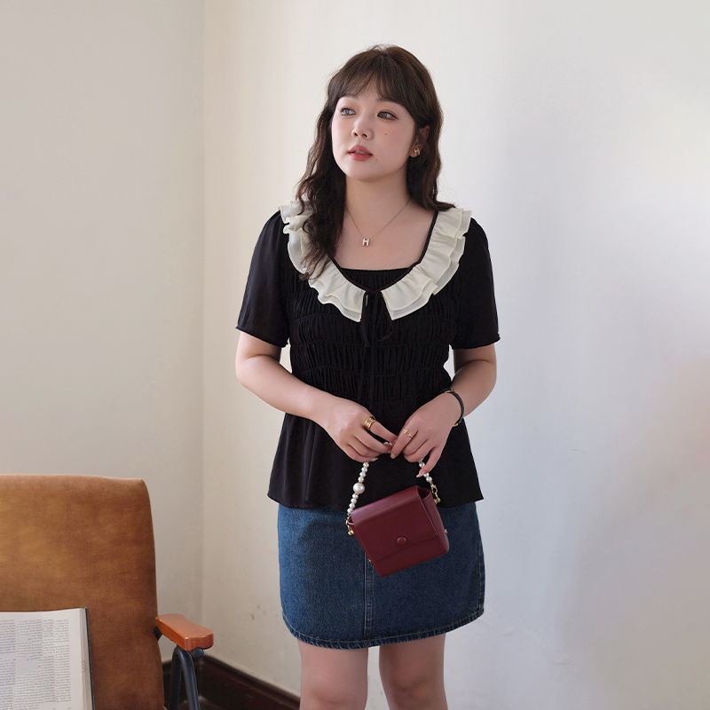 气质收腰显瘦褶皱衬衫 蓝若水大码 荷叶边方领上衣胖MM夏装 法式 女装