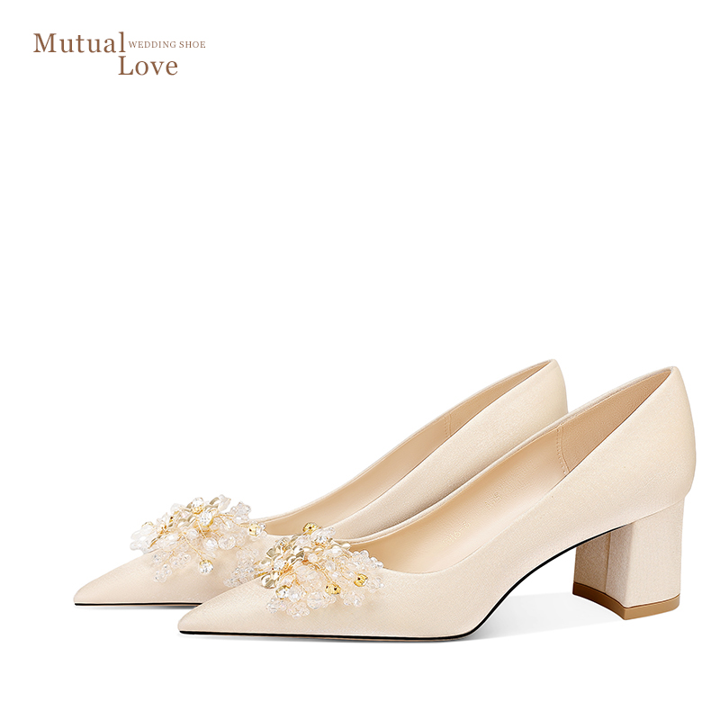 舒适低跟不累脚伴娘鞋 粗跟香槟色花朵主婚纱新娘鞋 女2024新款 婚鞋