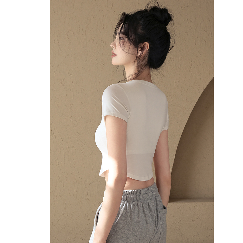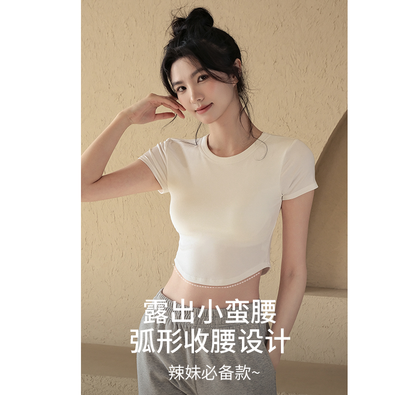 带胸垫运动文胸一体正肩打底体恤上衣 圆领短款 白色短袖 t恤女夏季