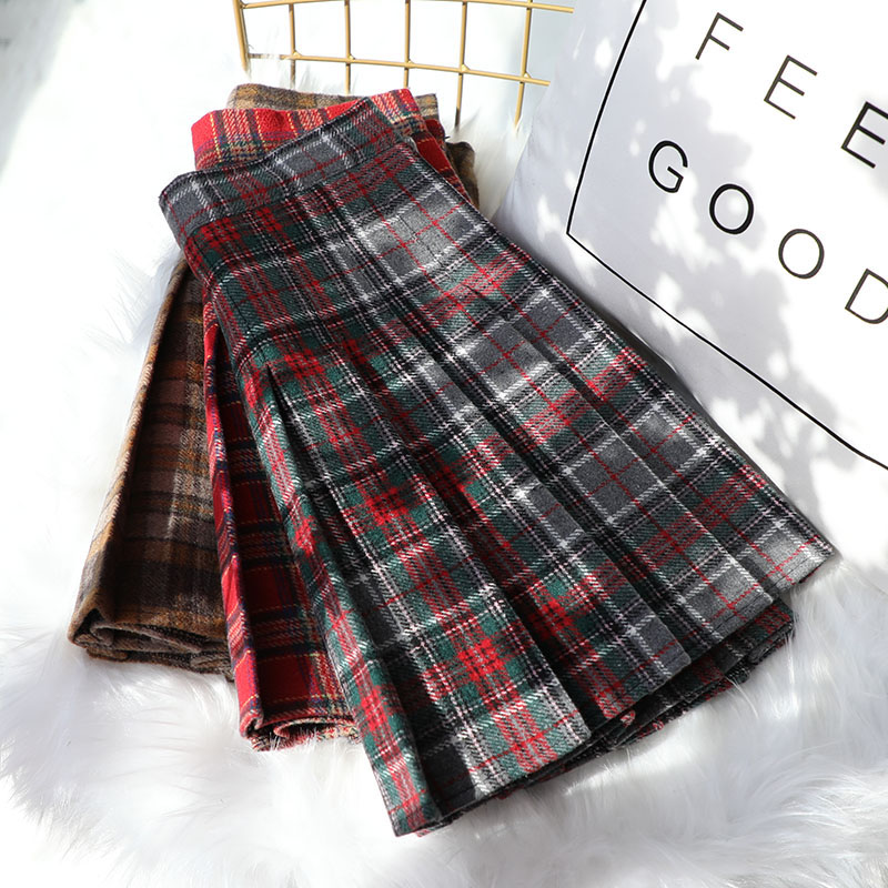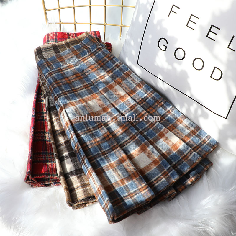 棕色格子百褶裙女秋冬高腰防走光毛呢加厚半身裙子显瘦a字短裙裤
