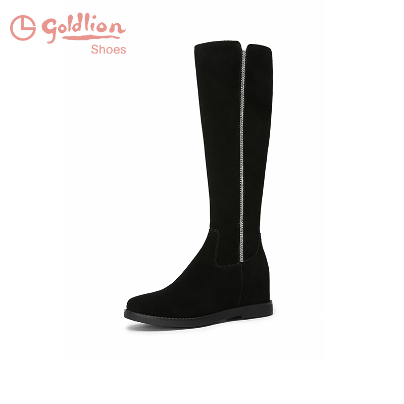 金利来长筒靴女秋冬时尚 内增高侧拉链加绒骑士靴黑色不过膝长靴