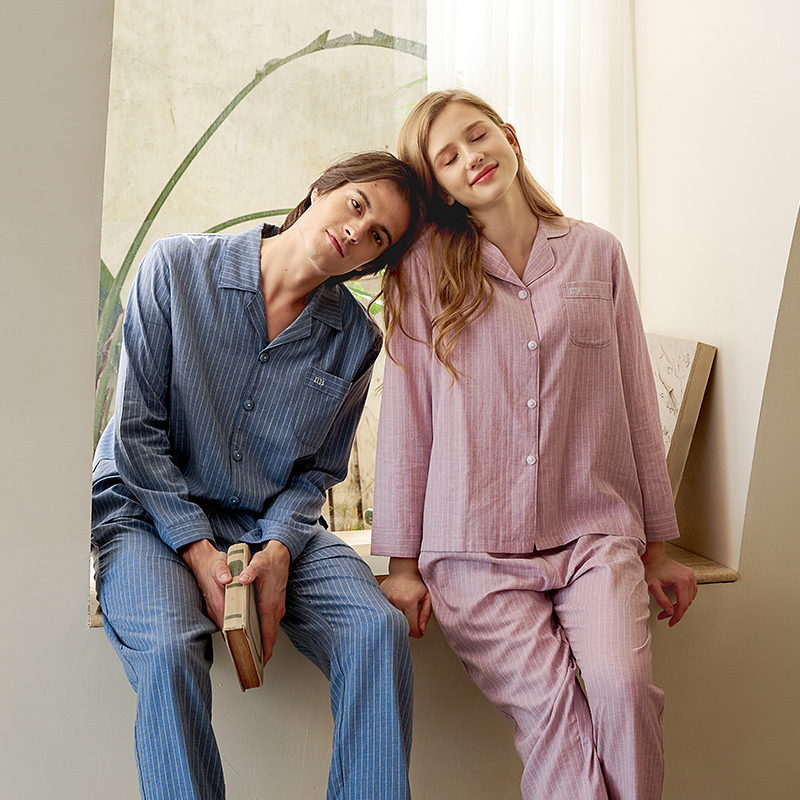 显瘦长袖 简约秋冬季 男女家居服 专柜同款 美标竖条纹情侣纯棉睡衣