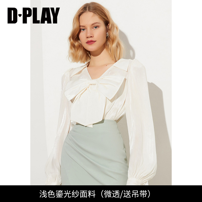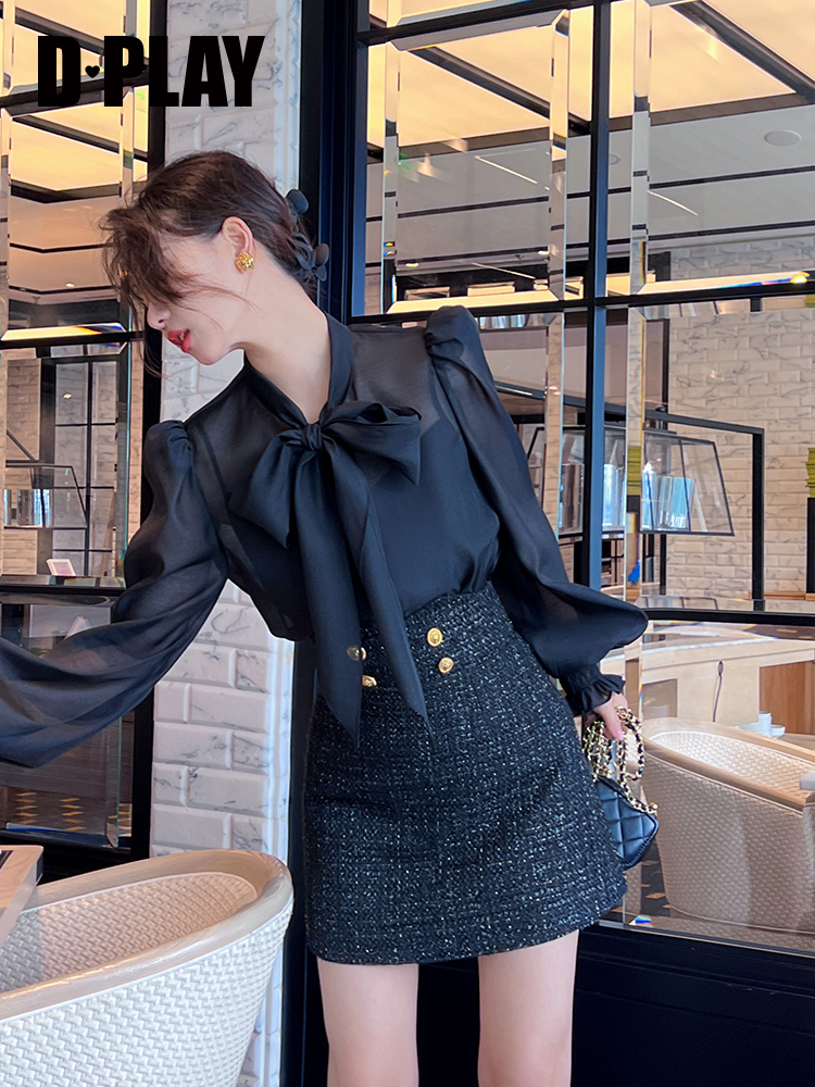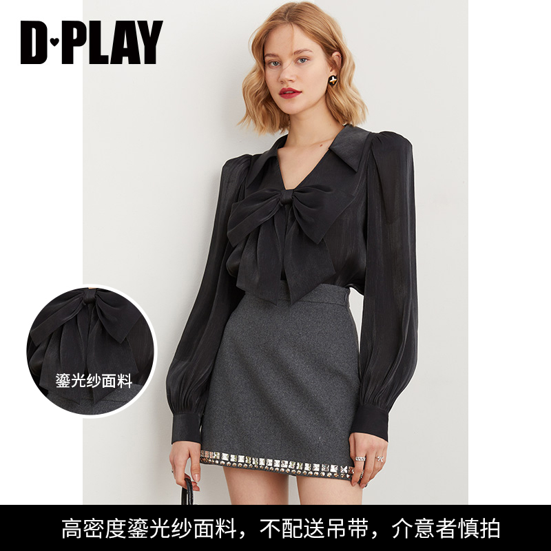 蝴蝶结衬衫 长袖 上衣黑女衬衣 气质通勤黑色泡泡袖 DPLAY2025秋季