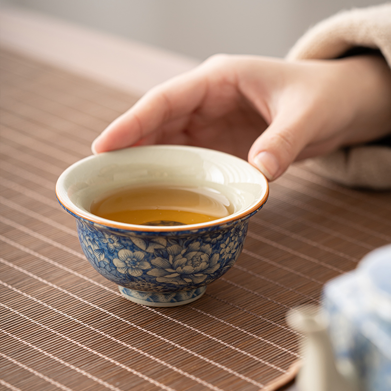 仿古汝窑繁花压手杯家用功夫茶具茶杯喝茶小杯子个人专用主人杯