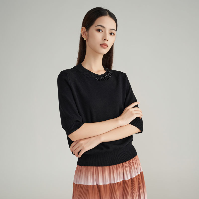 黑色钉珠圆领短袖 法式 针织衫 上衣气质时尚 流行 毛衫 马天奴秋冬女装
