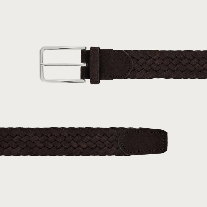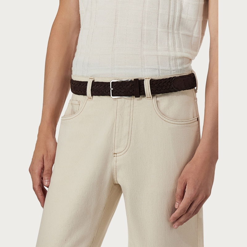 CANALI康纳利深棕色牛麂皮配矩形带扣男士 辫编腰带