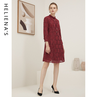 红色连衣裙女人味蕾丝A字裙 气质长袖 海兰丝2024秋冬新款 商场同款