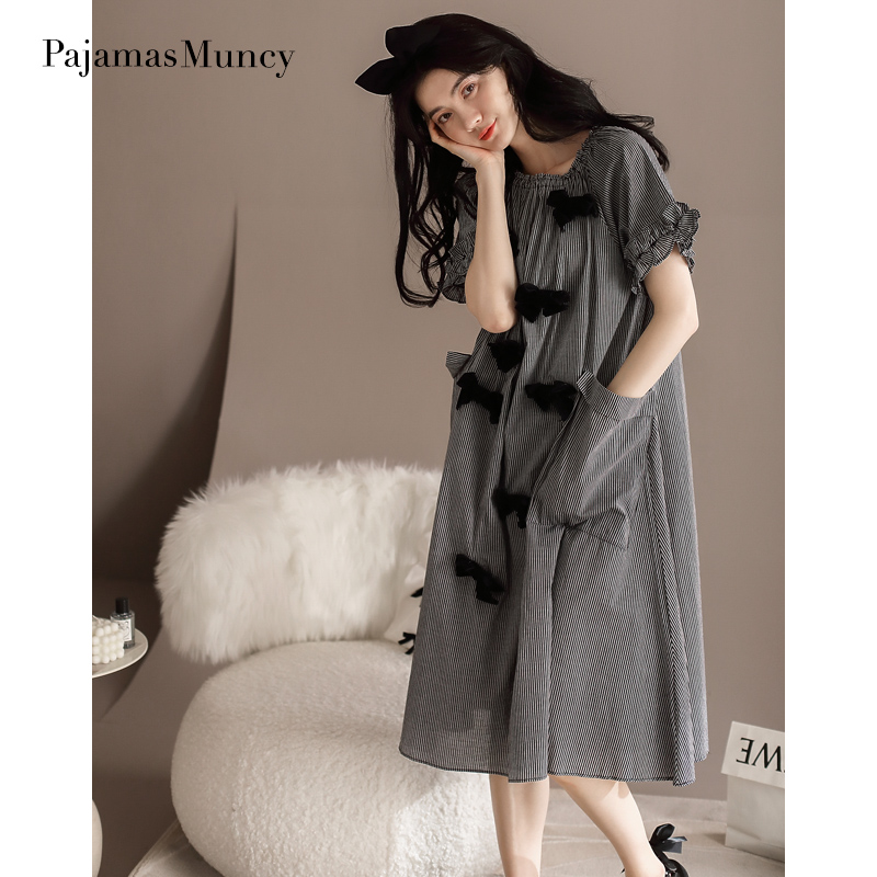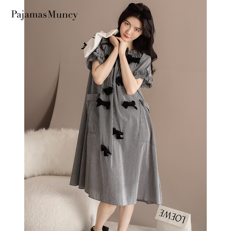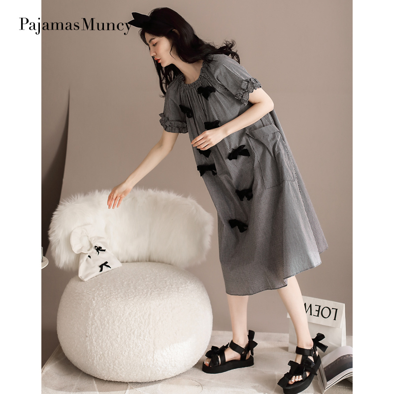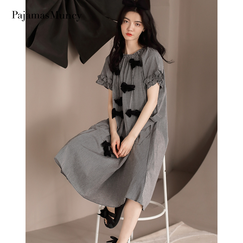 曼系睡裙女夏季 过膝可爱少女家居服全棉条纹睡衣 梭织纯棉宽松大码