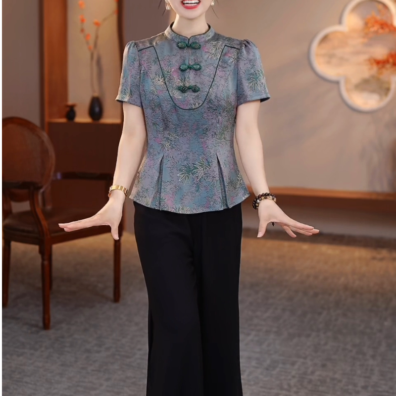 新款 女夏季 妈妈装 气质显瘦减龄阔腿裤 休闲新中式 两件套裤 国风套装