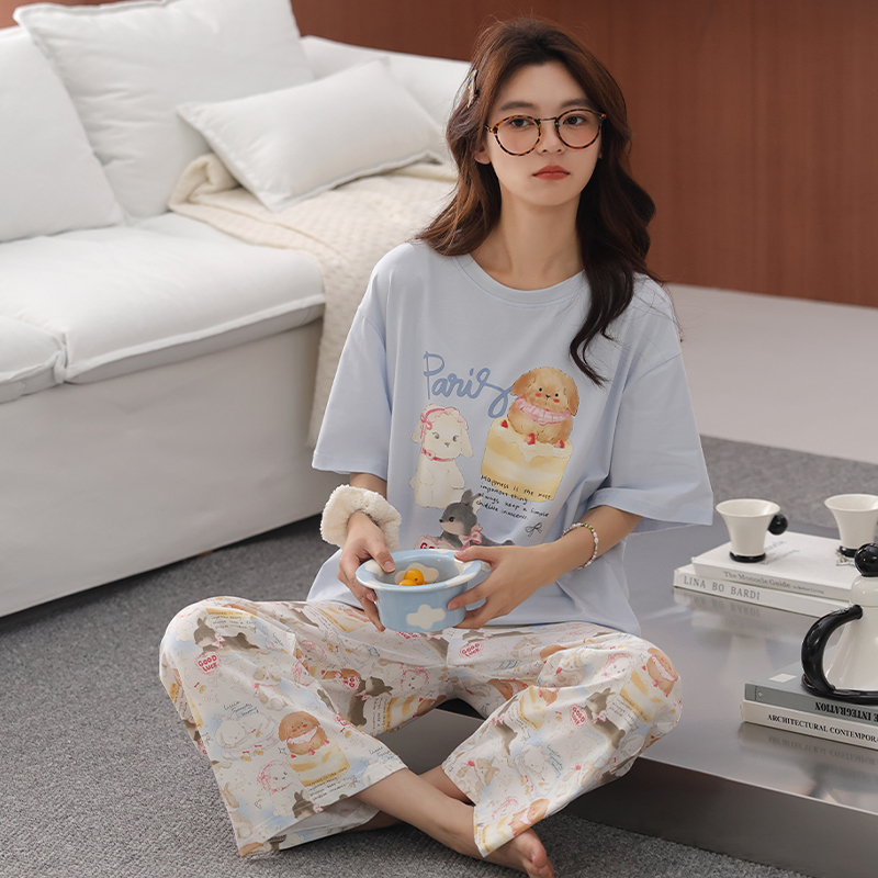 显年轻卡通印花休闲家居服 薄款 新一步纯棉带胸垫睡衣女士短袖 长裤