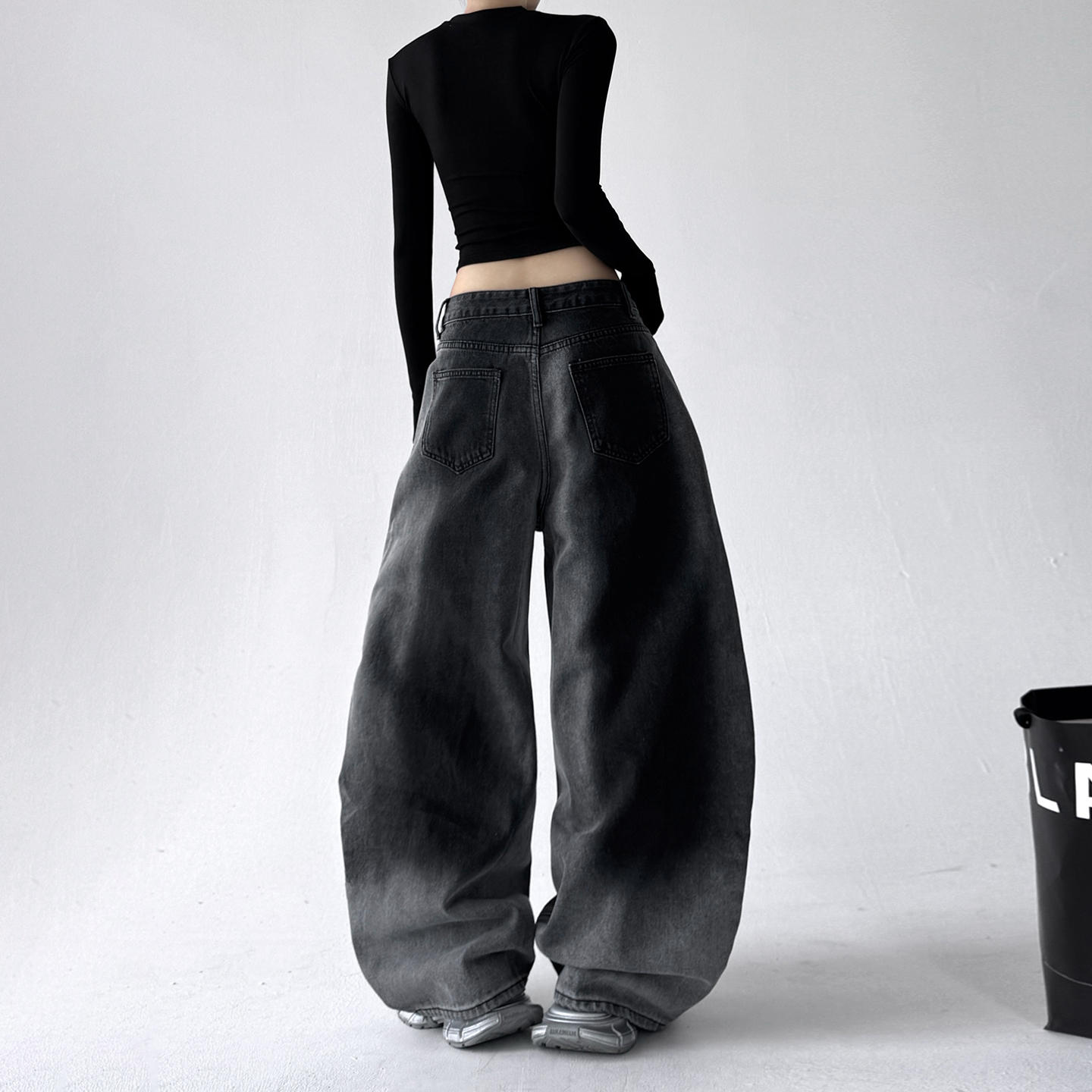子 春秋深蓝色高腰直筒复古明线宽松阔腿裤 丹宁蓝牛仔裤 女2025新款