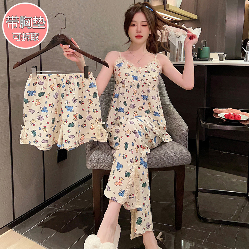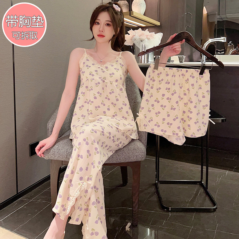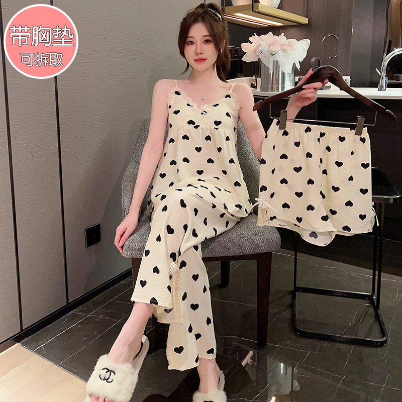 男春秋 带胸垫家居服套装 A类抗菌防螨纯棉情侣睡衣女长袖 红豆夏季