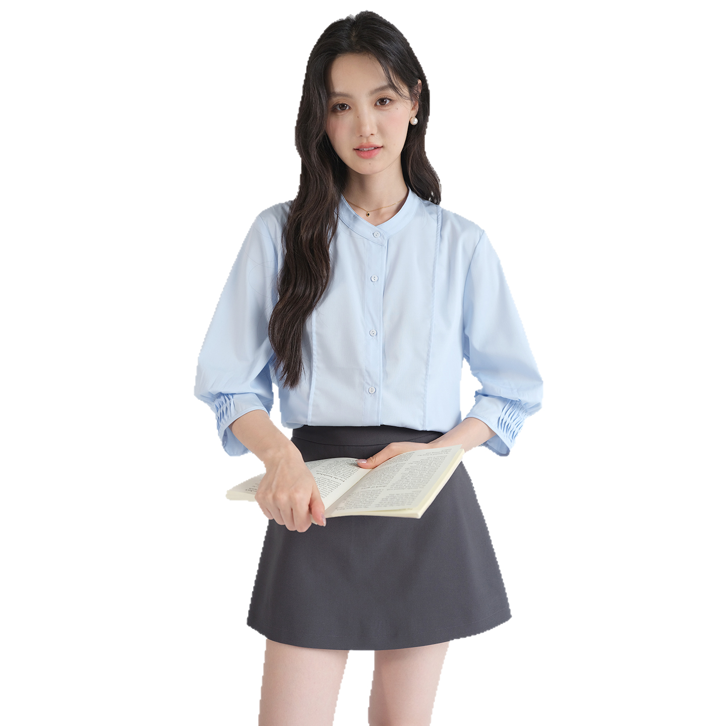 新款 2025秋季 压褶七分袖 衬衫 立领上衣 蓝若水大码 胖MM通勤法式 女装
