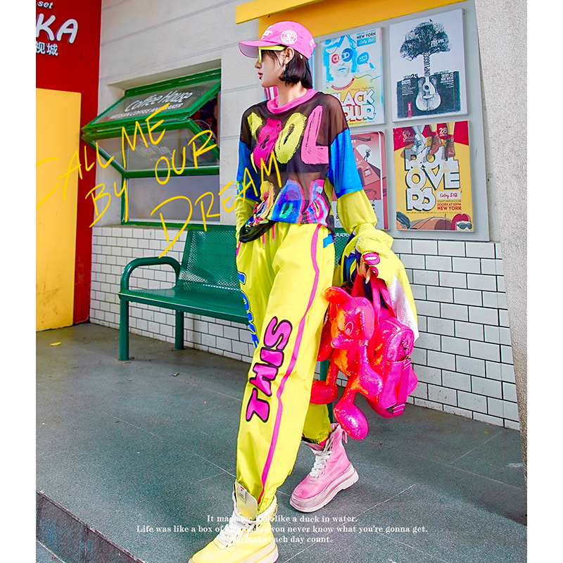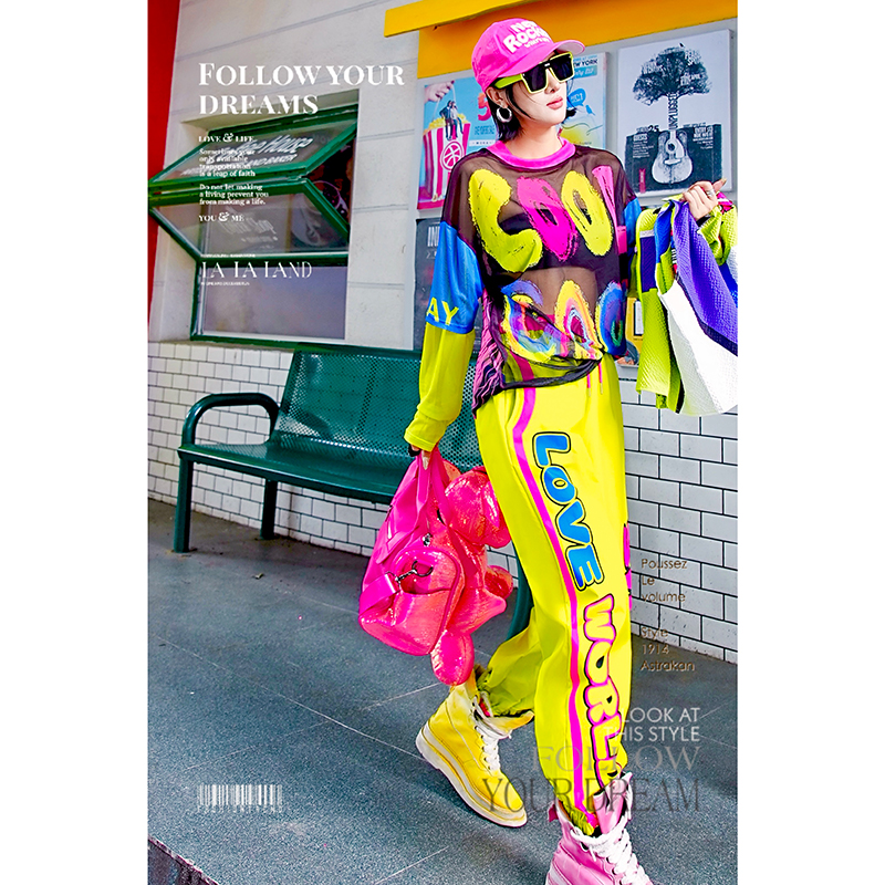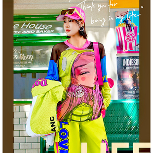 女 撞色卡通女孩潮牌宽松网纱打底衫 YHAY彩色字母休闲T恤秋季 新款