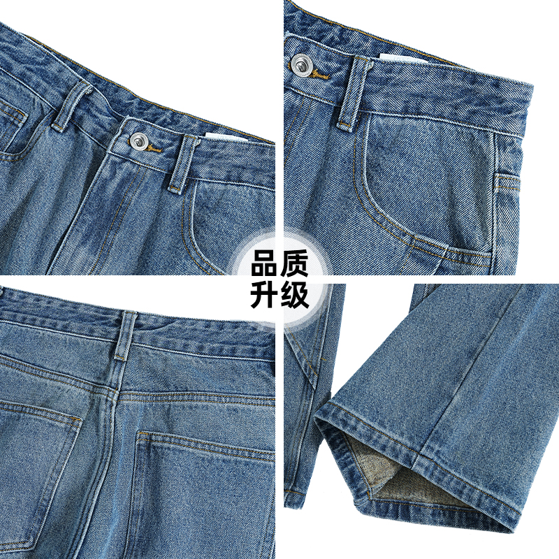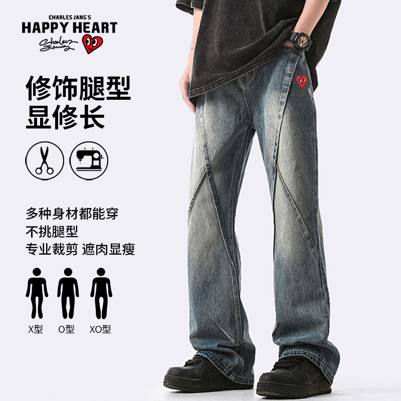 查尔斯桃心美式 男 复古高街拼接结构水洗做旧百搭显瘦微喇叭牛仔裤